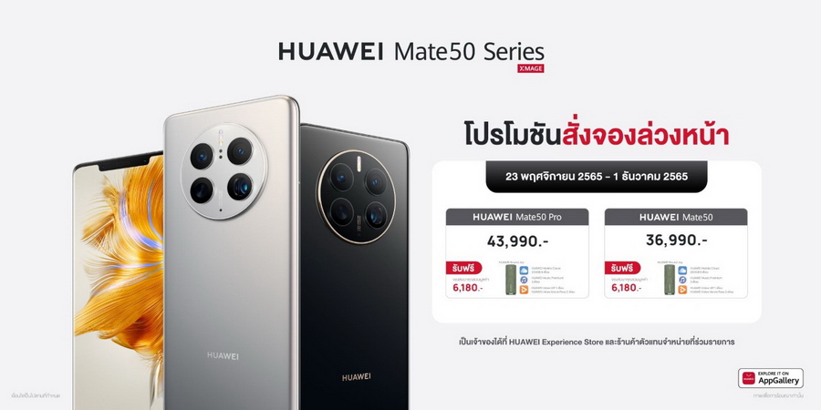HUAWEI Mate 50 Pro มาในราคา 43,990 บาท และ HUAWEI Mate 50 ราคา 36,990 บาท พร้อมโปรโมชันพรีออเดอร์ตั้งแต่วันที่ 23 พฤศจิกายน - 1 ธันวาคม 2565 สำหรับผู้ที่สั่งจองช่วงพรีออเดอร์รับฟรี HUAWEI Sound Joy มูลค่า 4,999 บาท พร้อมด้วยการใช้งานแอปพลิเคชันฟรี HUAWEI Mobile Cloud Storage 200 GB 6 เดือน HUAWEI Music Premium 3 เดือน HUAWEI Video VIP 1 เดือน และ HUAWEI Video Movie Pass 2 เดือน มูลค่ารวม 1,180 บาท รีบต่อคิวเป็นเจ้าของก่อนใครได้ที่ HUAWEI Experience Store และร้านค้าที่ร่วมรายการ รวมถึงช่องทางออนไลน์อย่าง HUAWEI Store และร้านค้าอย่างเป็นทางการของหัวเว่ยบน Lazada และแอปพลิเคชัน My HUAWEI และศึกษาข้อมูลโปรโมชั่นเพิ่มเติมได้ที่นี่