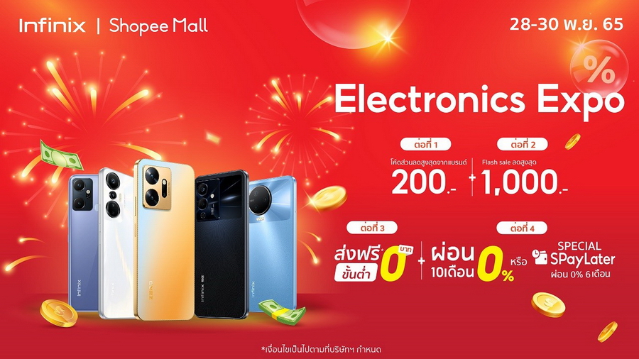 1. เมื่อซื้อสินค้าบน Shopee ระหว่างวันที่ 28 – 30 พฤศจิกายน 2565 รับส่วนลด 1,000 บาท โค้ดส่วนลดจากแบรนด์สูงสุด 200 บาท พร้อมบริการจัดส่งฟรี และข้อเสนอพิเศษ ผ่อน 0% นานสูงสุด 10 เดือน หรือผ่อนผ่าน Special SPayLater 0% นาน 6 เดือน อาทิ