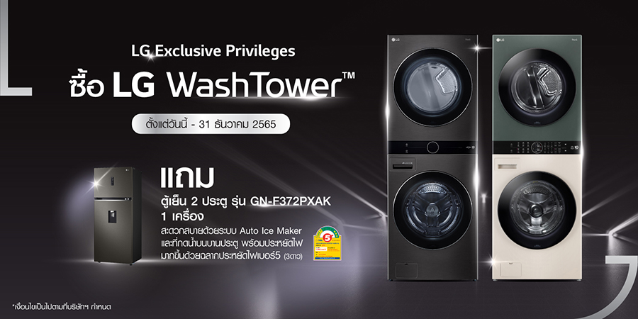 บริษัท แอลจี อีเลคทรอนิคส์ (ประเทศไทย) จำกัด เปิดตัว LG WashTower เครื่องซักผ้าและเครื่องอบผ้าในเครื่องเดียวที่มาในรูปแบบทาวเวอร์ โดดเด่นที่แผงควบคุมตรงกลางเดียวกันที่เชื่อมต่อเครื่องซักผ้าและเครื่องอบผ้าให้ทำงานร่วมกันโดยอัตโนมัติ สามารถใช้งานได้ง่ายและสะดวกสบายมากขึ้น พร้อมฟังก์ชันอัจฉริยะ AI DD ซึ่งเป็นการผสานการใช้เทคโนโลยี AI กับมอเตอร์เอกสิทธิ์เฉพาะของแอลจี Inverter Direct Drive ที่ทำความสะอาดผ้าได้ล้ำลึกและอ่อนโยน ลดการเสียหายของเนื้อผ้าได้ถึง 10% มาพร้อมกับเทคโนโลยี Smart Pairing ที่จดจำการตั้งค่าของเครื่องซักผ้าที่เหมาะสมที่สุดกับน้ำหนักและเนื้อผ้าแต่ละชนิด และใช้การตั้งค่าชุดเดียวกันเพื่อเตรียมเครื่องอบผ้าให้อยู่ในอุณหภูมิที่เหมาะสม ช่วยให้ผู้ใช้งานประหยัดเวลาในการซักและอบผ้า โดยไม่ต้องกังวลว่าเสื้อผ้าจะเกิดความเสียหาย โดยแอลจียังจัดโปรโมชันเอาใจผู้บริโภค เพียงซื้อ Wash Tower แถมฟรีตู้เย็น 2 ประตู ฉลากประหยัดไฟเบอร์ 5 ระดับ 3 ดาว รุ่น GN-F372PXAK ที่โดดเด่นด้วยระบบ Auto Ice Maker และที่กดน้ำบนบานประตู ตั้งแต่วันนี้จนถึงวันที่ 31 ธันวาคม 2565 ณ ห้างสรรพสินค้าชั้นนำทั่วไปและช่องทางออนไลน์ของแอลจี