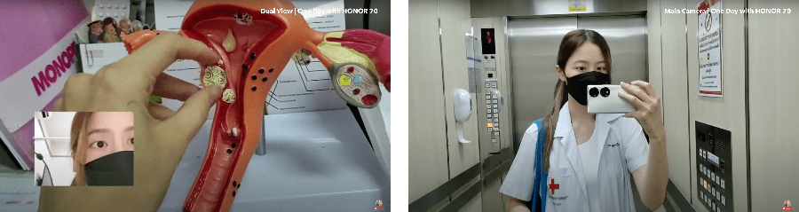 "เชื่อว่าทุกโมเมนต์เกิดขึ้นครั้งเดียวในชีวิต และไม่มีทางเกิดซ้ำ ถึงแม้จะเป็นวันทำงานธรรมดาๆ มันก็ยังมีความพิเศษอยู่ในตัว ฟรังจึงอยากพาทุกคนร่วมสัมผัสกับชีวิตแพทย์ฝึกหัดใน 1 วัน รับบทไกด์นำทัวร์ในแผนกสูตินรีเวชทั้งที ผู้ชมก็ต้องเห็นหน้าตอนเล่าแนะนำอุปกรณ์ในห้องตรวจผู้ป่วยนอก ต้องขอบคุณโหมด Dual View ใน HONOR 70 ที่ทำให้อัดวิดีโอจากกล้องหน้าและกล้องหลังได้พร้อมกัน ทำให้ประหยัดเวลามาก ไม่ต้องถ่ายกล้องหลังที กล้องหน้าทีเหมือนเมื่อก่อน เกือบตลอดวันทำงานของฟรังต้องเดินในอาคารตลอด แสงไฟก็อึมครึม แต่ไม่ทำให้วิดีโอหมองเลย หน้าสว่างใสสุดๆ ด้วยโหมด Beauty ที่ช่วยปรับสภาพผิวให้ออร่าอัตโนมัติ ในขณะที่กล้องหลังความละเอียดถึง 54MP ถ่าย Vlog ได้ทุกสถานการณ์ ไม่ว่าจะในที่แสงน้อยหรือย้อนแสงก็หายห่วง อีกทั้งยังสามารถตัดต่อและตกแต่งวิดีโอได้ในเครื่อง โดยไม่ต้องใช้แอปอื่น พร้อมลงโซเชียลได้ทันที เรียกได้ว่า HONOR 70 เครื่องเดียวก็คือครบจบสำหรับสายทำคอนเทนต์" Vlog 1 วันทำงานธรรมดาๆ ที่น่าจดจำของ LaohaiFrung ส่งต่อแรงบันดาลใจให้ทุกคนลองเปลี่ยนวันธรรมดาให้น่าจดจำยิ่งขึ้นผ่านการบันทึกภาพและวิดีโอ