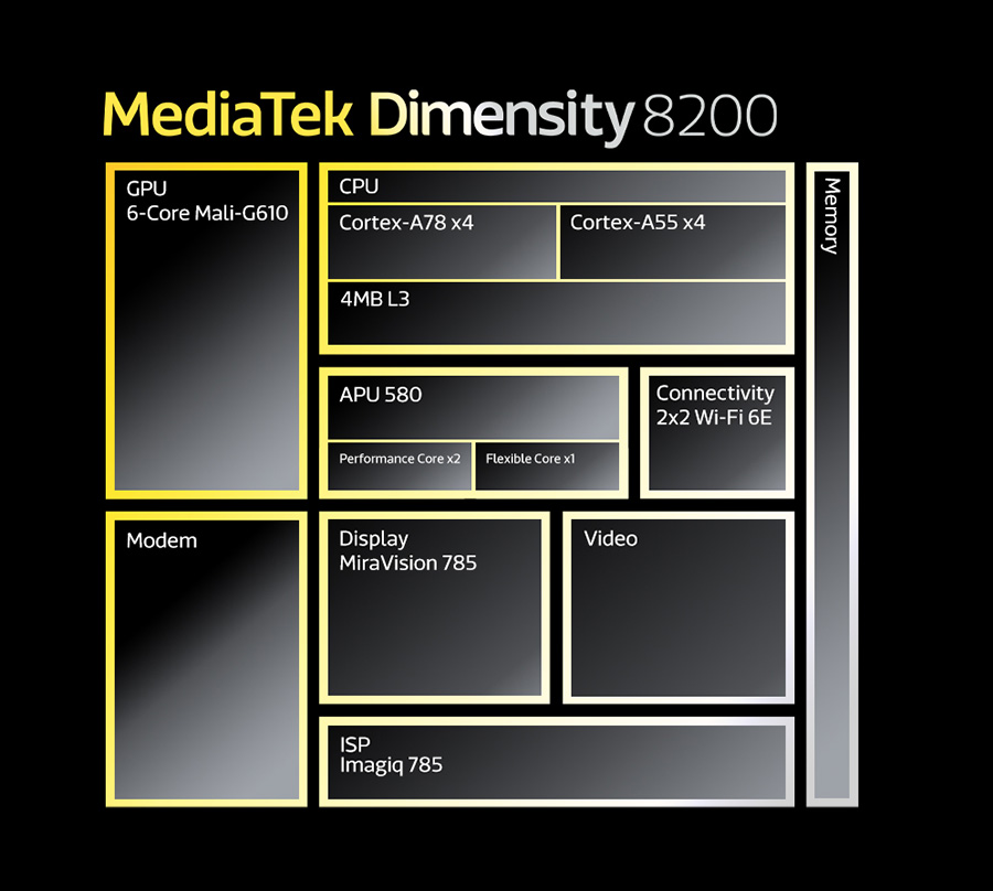 MediaTek แถลงข่าวเปิดตัว Dimensity 8200 ชิปเซ็ตล่าสุดสำหรับสมาร์ทโฟน 5G ระดับพรีเมี่ยม สมาร์ทโฟนที่ขับเคลื่อนโดย Dimensity 8200 จะมอบประสบการณ์ระดับเรือธง ทั้งการเชื่อมต่อ เกมมิ่ง มัลติมีเดีย จอแสดงผล และการถ่ายภาพ ในราคาที่เข้าถึงได้มากขึ้น ผลิตขึ้นจากกระบวนการ 4nm และประหยัดพลังงานแบบไม่มีใครเทียบได้ และยังผสานรวม CPU แบบ Octa-Core เข้ากับ Arm Cortex-A78 สี่คอร์ที่ทำงานด้วยความเร็วสูงสุด 3.1 GHz พร้อมกับเอนจินกราฟิก Mali-G610 ที่ทรงพลัง เพื่อประสิทธิภาพที่ดีขึ้นในการใช้งานทุกแอปพลิเคชั่น