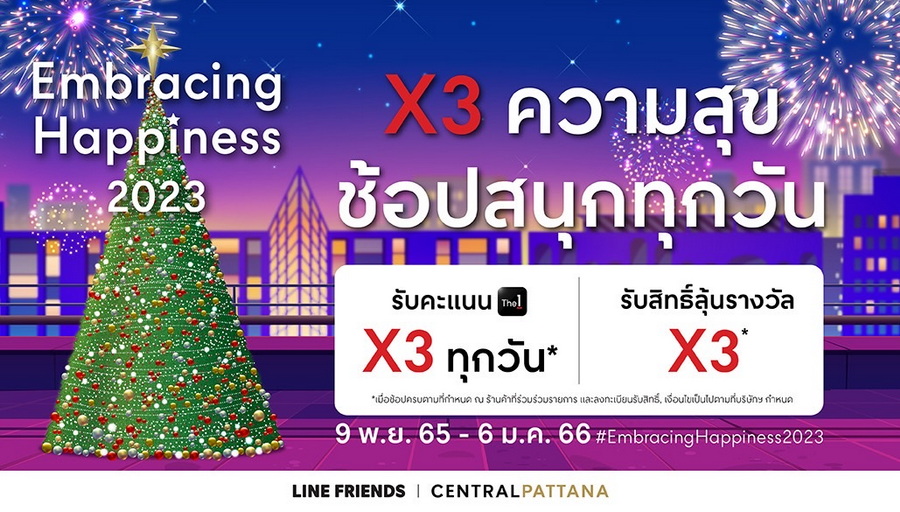 ในช่วงปลายปี The 1 ยังมอบความสุขผ่านแคมเปญ Embracing Happiness 2023 ให้กับสมาชิก The 1 รับคะแนน X3 ทุกวัน ทุกบิล และรับสิทธิ์ลุ้นรับรางวัลใหญ่ X3 อาทิ รถยนต์ HAVAL JOLION รุ่น ULTRA และตั๋วโดยสารไป-กลั บภายในประเทศ 2 ที่นั่ง จากสายการบิน Nok Air เมื่อใช้จ่ายกับร้านค้าที่เป็ นแบรนด์พาร์ทเนอร์ The 1 Biz หรือช้อปกับร้านค้าที่ร่ วมรายการและลงทะเบียนในทุกศูนย์ การค้าเซ็นทรัลรวม 38 สาขาทั่วประเทศ (จำกัดการรับแลกคะแนนเพิ่มสูงสุ ด 20,000 คะแนนต่อหมายเลขสมาชิก The 1 ตลอดรายการ ระหว่าง วันที่ 9 พฤศจิกายน 2565 - 6 มกราคม 2566 นี้เท่านั้น)