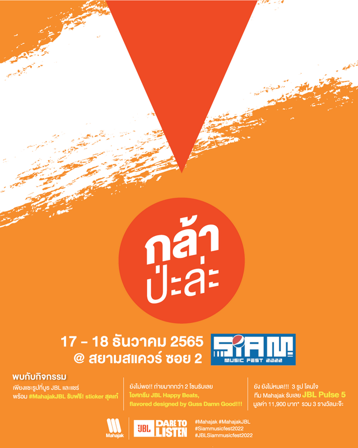 เมื่อถ่ายภาพในโซนต่าง ๆ แล้ว โพสต์ลง Facebook, Instagram ตั้งค่าเป็นสาธารณะ และติดแฮชแท็ก #MAHAJAK #MAHAJAKJBL #SIAMMUSICFEST2022 #JBLSIAMMUSICFEST2022 ถ่ายภาพมากกว่า 2 โซน รับไอศกรีมรสชาติ JBL Happy Beats by Guss Damn Good ฟรี!!