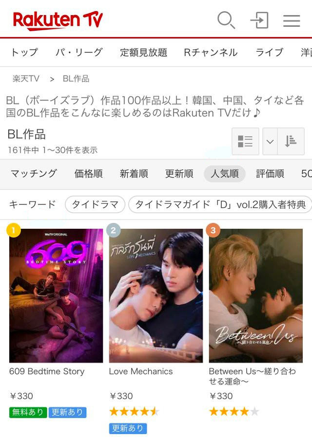 ส่วนเรื่อง “กลรักรุ่นพี่” เรื่องราวความรักในรั้วคณะวิศวกรรมของหนุ่มวิศวะ แม้จะหลังช่วงที่ออนแอร์ครั้งแรกไปแล้ว แต่ความแรงของเรื่องนี้ก็ยังอยู่ใน Top ranking ของ Rakuten TV ในหมวดซีรีส์วาย (BL) เช่นกัน