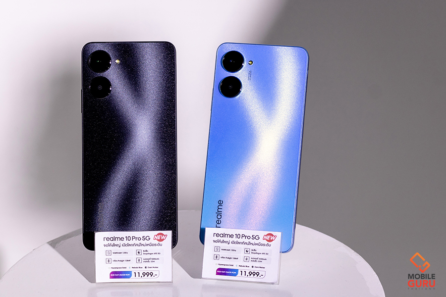 "realme 10 Pro Series" วางจำหน่าย 2 รุ่น ได้แก่ realme 10 Pro+ 5G มอบจอโค้งใหญ่เปิดโลกทัศน์ใหม่เหนือระดับ สัมผัสคอนเทนต์อย่างเต็มอรรถรสด้วยกับจอ Refresh Rate 120Hz และเทคโนโลยีการปรับความสว่างหน้าจอระดับ 2160Hz PWM ที่ถนอมสายตาดีที่สุดในปัจจุบัน มีให้เลือก 2 สีคือสีทองไฮเปอร์สเปซและสีดำดาร์คแมตเตอร์ และรุ่น realme 10 Pro 5G มอบความคุ้มค่าด้วยจอ Refresh Rate 120Hz เป็นรุ่นแรกในสมาร์ตโฟนเซกเมนต์เดียวกัน มอบประสิทธิภาพเต็มสปีดในทุกแอปพลิเคชันด้วย Snapdragon 695 5G มีให้เลือก 3 สี คือ สีทองไฮเปอร์สเปซ สีฟ้าเนบิวลา และสีดำดาร์คแมตเตอร์