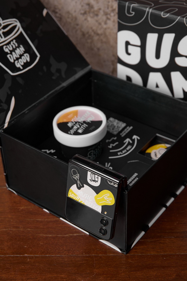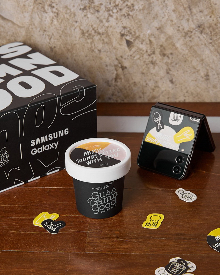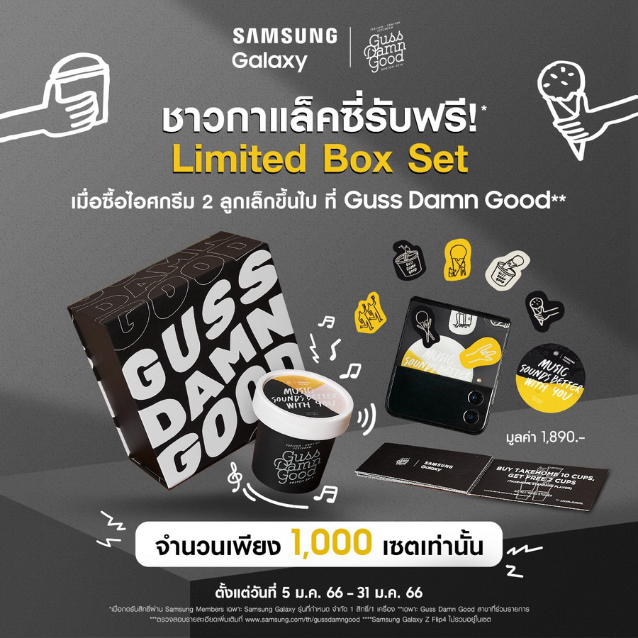 สำหรับลูกค้าที่ใช้ Samsung Galaxy รุ่นที่กำหนด เมื่อซื้อไอศกรีมรสชาติใดก็ได้ในร้าน Guss Damn Good สาขาที่ร่วมรายการ ตั้งแต่ 2 ไมโครสกู๊ป (2 Micro scoops หรือ 2 ลูกเล็ก) ขึ้นไป ตั้งแต่วันที่ 5 ม.ค. 66 – 31 ม.ค. 66 หรือจนกว่า Limited Box Set จะหมด รับฟรี Box Set มูลค่ารวม 1,890 บาท ประกอบด้วย