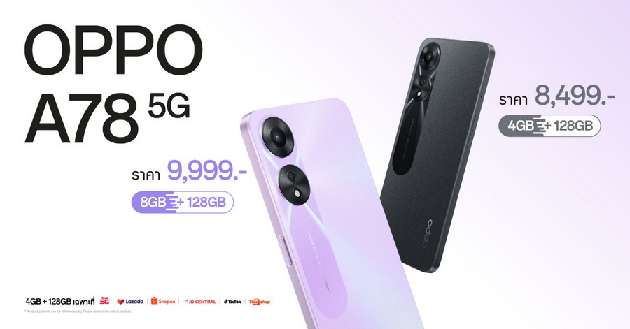 OPPO A78 5G มาใน 2 สีให้เลือกได้แก่ สีม่วง Glowing Purple และสีดำ Glowing Black โดย OPPO A78 5G รุ่น 8GB วางจำหน่ายในราคา 9,999 บาททุกช่องทาง พร้อมรับของแถมสุดพิเศษ E-VIP Card มูลค่า 4,000 บาท และ OPPO Trendy Bag มูลค่า 1,999 บาท มูลค่ารวม 5,999 บาท ตั้งแต่วันนี้ - 28 กุมภาพันธ์ 2566 และ ยังมี OPPO A78 5G รุ่น 4GB วางจำหน่ายในราคา 8,499 บาท ที่ทรูช็อปทั่วประเทศ, Lazada, Shopee, JD Central, TikTok @OPPOThailand และ Thisshop