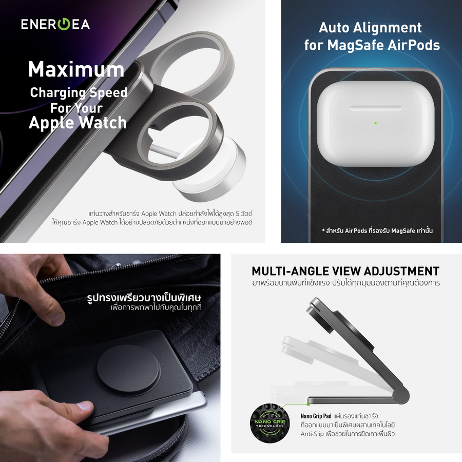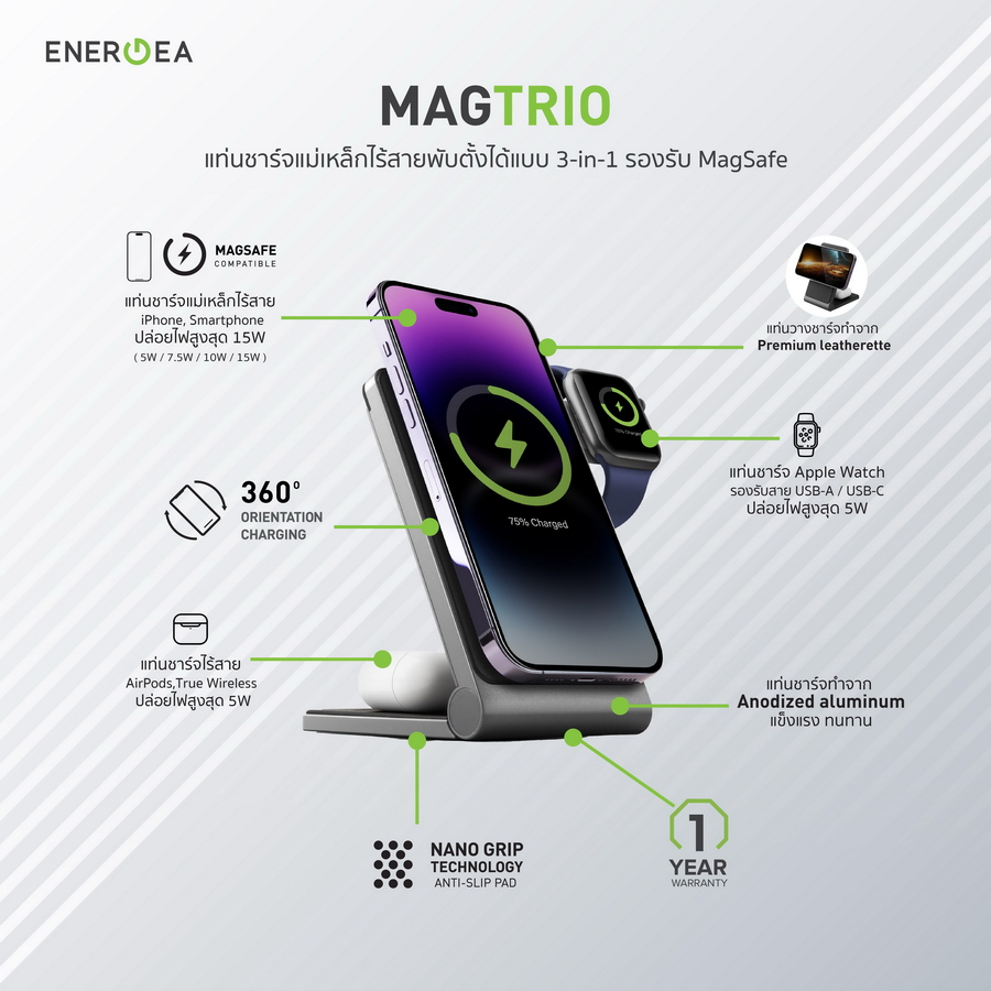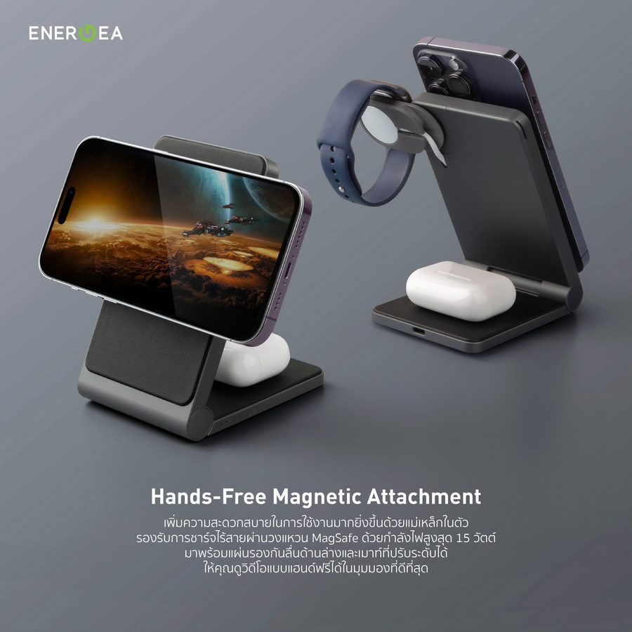 นอกจากนี้ MAGTRIO ยังมาพร้ อมบานพับที่แข็งแรง รวมถึงมีแผ่นรองกันลื่นและเมาท์ ที่ปรับระดับได้ จึงทำให้สามารถปรับมุมมองการใช้ งานได้ตามต้องการ ช่วยให้คุณดูวิดีโอแบบแฮนด์ฟรี ได้ในมุมมองที่ดีที่สุด แถมยั งสามารถชาร์จอุปกรณ์ได้อย่างอิ สระทั้งแนวตั้งและแนวนอน ตัวแท่นชาร์จทำจาก Anodized Aluminium จึงแข็งแรง ทนทาน และชาร์จโทรศัพท์ได้อย่างปลอดภั ย พร้อมฐานรอง Nano Grip Pad ที่ผสานเทคโนโลยี Anti- Slip ให้ผิวสัมผัสที่เรียบเนี ยนและช่วยในการยึดเกาะบนพื้นผิ วได้เป็นอย่างดี ส่วนแผ่นรองแท่นชาร์จเพิ่ มความหรูหราด้วยวัสดุ Premium Leatherette โดย Energea แท่ นชาร์จแม่เหล็กไร้สายพับตั้งได้ แบบ 3-in-1 รองรับ MagSafe รุ่ น MagTrio วางจำหน่ายในราคา 2, 690 บาท