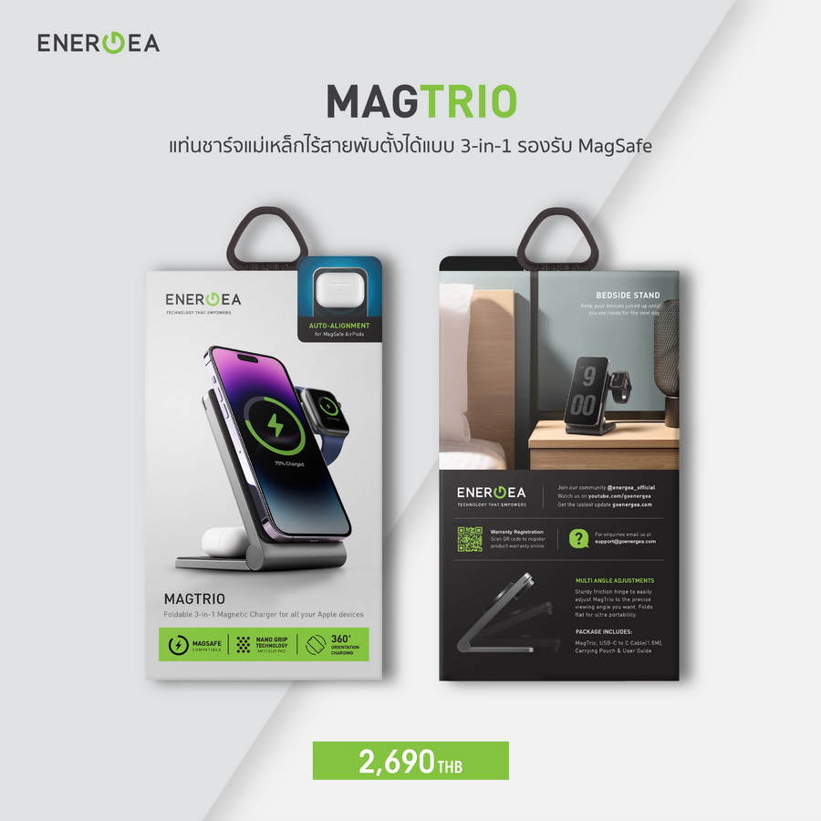 บริษัท อาร์ทีบี เทคโนโลยี จำกั ด ผู้นำเข้าและจัดจำหน่ายสินค้ าแก็ดเจ็ตรายใหญ่ในประเทศไทย และเป็นตัวแทนจำหน่ายอุปกรณ์ เสริมด้านพาวเวอร์โซลูชั่นระดั บพรีเมียมภายใต้แบรนด์ “ Energea” (เอ็นเนอร์เจีย) ส่งแท่นชาร์จแม่เหล็ก(MagClick) ไร้สายรุ่นใหม่ล่าสุด “MAGTRIO” เอาใจสาวก Apple ให้ใช้งานได้ อย่างสะดวกสบายยิ่งขึ้น โดย MAGTRIO เป็นแท่นชาร์จแม่ เหล็กไร้สายแบบ 3-in-1 ที่มาพร้ อมพลังการชาร์จแบบมัลติฟังก์ชั่ น ทำให้สามารถชาร์จอุปกรณ์ได้อย่ างรวดเร็วถึง 3 อุปกรณ์พร้อมกัน ทั้ง iPhone, AirPods และ Apple Watch โดดเด่นด้วยรูปทรงที่เพรี ยวบาง สะดวกต่อการพกพาไปใช้งานได้ทุ กที่ รองรับการชาร์จไร้สายแบบ MagSaf e ผ่านวงแหวนแม่เหล็กในตัวด้ วยกำลังไฟสูงสุด 15 วัตต์ มาพร้อมแท่นวางสำหรับชาร์จ Appl e Watch ซึ่งสามารถปล่อยกำลั งไฟได้สูงสุด 5 วัตต์ รองรับทั้งสาย USB-C และ USB-A นอกจากนี้ ยังมีแท่นชาร์จสำหรับ AirPods เ พียงวางลงบนแท่นชาร์จ คุณก็สามารถชาร์จ AirPods ได้ อย่างง่ายดายด้วยกำลังไฟสูงสุด 5 วัตต์