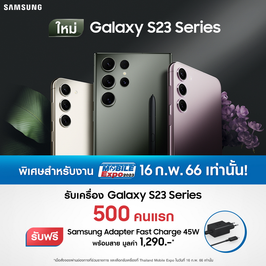 วันนี้ซัมซุงจะชวนสัมผัส Galaxy S23 Series ในงาน Thailand Mobile Expo 2023 วันที่ 16 ก.พ. 66 เท่านั้น! กับงานมหกรรมมือถือที่ใหญ่ที่สุ ดในประเทศ เปิดโอกาสให้แฟนๆ ชาวไทยได้สัมผัสเครื่องอย่ างใกล้ชิด และมากไปกว่านั้นพิเศษสุดๆ! สำหรับท่านที่สั่งจองผ่านช่ องทางที่ร่วมรายการ และเลือกรับเครื่องที่งาน Thailand Mobile Expo 2023 ในวันที่ 16 ก.พ. สำหรับลูกค้า 500 คนแรกที่เป็นเจ้าของเครื่ องจะได้รับ Samsung Adapter Fast Charge 45W พร้อมสายมูลค่า 1,290 บาท ฟรี! สถานที่สำหรับรอคิวเข้ารับเครื่ อง ตรงโซนทางเข้า ระหว่าง Hall 5 กับ Hall 6