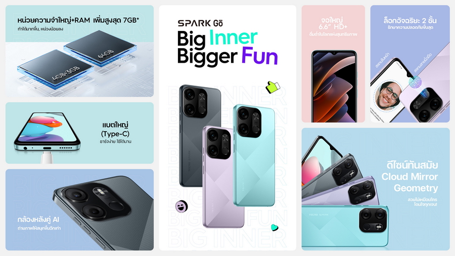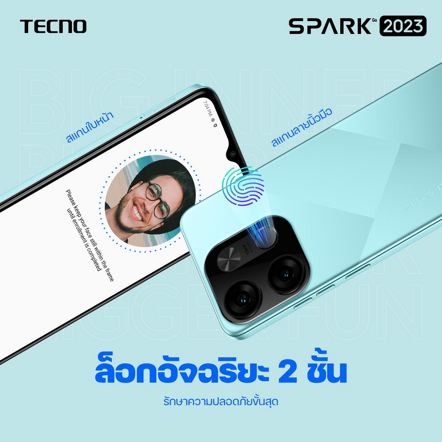 จุดขายที่โดดเด่นของ SPARK Go 2023 คือ เป็นสมาร์ทโฟนที่มาพร้อมความจุ ขนาดใหญ่ ขยาย RAM ได้สูงสุด 7GB ใช้งานได้สนุกมากขึ้น หน่วงน้อยลง พร้อมเก็บภาพความทรงจำของปี 2566 ได้จุใจใน ROM ความจุ 64GB พอร์ต Type-C ที่พร้อมเชื่อมต่อเข้าถึ งความสนุกได้มากกว่าเดิม มาพร้อมกับแบตเตอรี่ความจุใหญ่ 5,000 mAh ชาร์จไว 10W ดีไซน์ทันสมัย Cloud Mirror Geometry ซึ่งเป็นการออกแบบที่ทำให้ตั วเครื่อง เพรียวบาง สามารถพกพาได้สะดวกเหมาะกับไลฟ์ สไตล์แห่งยุค 2566 มาพร้อมตัวเลือกสีที่พร้อมให้ เป็นเจ้าของแบบที่ใช่ ทั้งสีฟ้า Uyuni Blue และสีดำ Endless Black มาพร้อม 2 ระบบปลดล็อกหน้าจอสุดอัจฉริยะ สแกนใบหน้าและสแกนลายนิ้วมือที่ ออกแบบมาตามสรีระการหยิบจับมื อถือ ทำให้เข้าถึงความสนุกได้ง่ ายและรวดเร็วยิ่งขึ้น หน้าจอใหญ่ขนาด 6.6” ความละเอียด HD+ พร้อมเทคโนโลยี AI อัจฉริยะ ลดอาการสายตาล้า ปรับความสว่างให้ภาพคมชัดในที่ แสงจ้า ถนอมสายตาในที่แสงน้อย และพิเศษกับ กล้องถ่ายภาพ AI กล้องหลังคู่ 13MP + 5MP