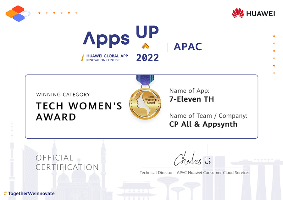 แอปพลิเคชัน 7-Eleven ประเทศไทย คว้ารางวัล Tech Women's Award จากเวทีหัวเว่ย โกลบอล แอป อินโนเวชัน คอนเทสต์ (Huawei Global App Innovation Contest "Apps UP 2022") เวทีที่รวบรวมเหล่านักพัฒนาแอปพลิเคชั่นทั่วโลก ที่มีส่วนช่วยให้ผู้ใช้งานได้รับประสบการณ์ที่ยอดเยี่ยมที่สุดบนระบบแอปพลิเคชันของหัวเว่ย