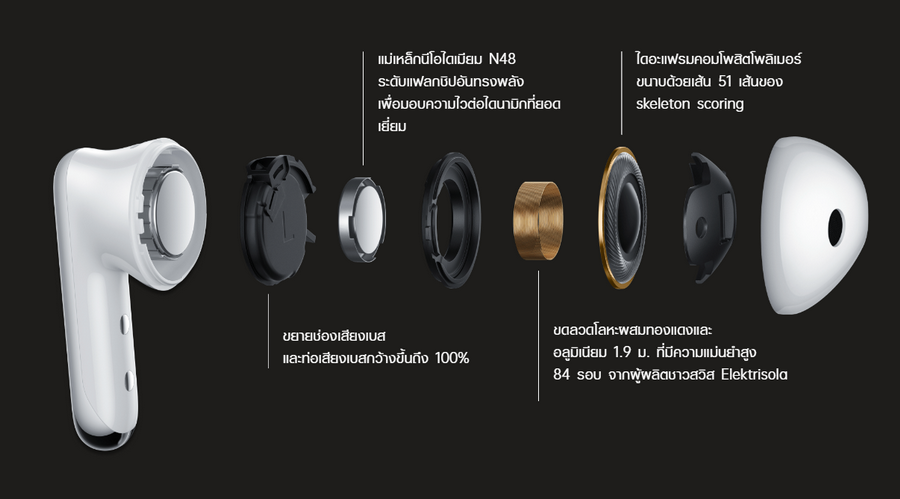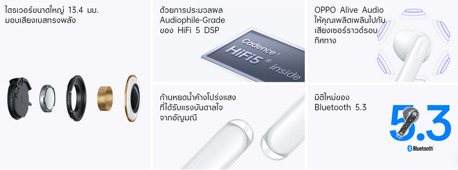 OPPO Enco Air3 มอบเสียงทรงพลังกว่าที่เคยด้วยการเป็นหูฟังไร้สายรุ่นแรกที่มาพร้อม DSP ประสิทธิภาพสูงในช่วงราคานี้ ให้พลังการประมวลผลที่มากขึ้น ประหยัดพลังงาน และมอบอายุแบตเตอรี่ที่นานขึ้น คมชัดทุกการรับฟังด้วยไดรเวอร์ยูนิตไดนามิกขนาดใหญ่พิเศษ 13.4 มม. มอบเสียงเบสและเสียงร้องที่ชัดเจนและมีชีวิตชีวามากยิ่งขึ้น ดื่มด่ำความบันเทิงได้เต็มอรรถรสด้วย 94ms low-latency มีความหน่วงในการส่งข้อมูลต่ำของ Bluetooth 5.3 ทำให้ความหน่วงจากต้นทางถึงปลายทางอยู่ที่ 94 มิลลิวินาที ให้ Bluetooth 5.3 ยังสามารถใช้งานภายใต้สัญญาณรบกวนได้ดียิ่งขึ้นBluetooth 5.3 มอบการซิงโครไนซ์ภาพและเสียงที่ดียิ่งขึ้น อีกทั้้งยังสามารถเชื่อมต่อกับอุปกรณ์สองเครื่องพร้อมกัน โดยไม่ต้องตัดการเชื่อมต่อจากอุปกรณ์บลูทูธเครื่องหนึ่งแล้วเชื่อมต่อใหม่อีกครั้ง มาพร้อมอายุการใช้งานแบตเตอรี่ยาวนานถึง 25 ชั่วโมง ให้คุณใช้งานได้ลื่นไหล ไม่มีสะดุด