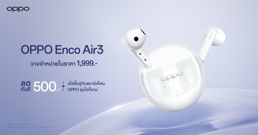 ออปโป้ ไทยแลนด์ วางจำหน่าย “OPPO Enco Air3” หูฟังไร้สายดีไซน์เทรนดี้ด้วยเคสชาร์จโปร่งแสง มอบเสียงทรงพลัง คมชัด สมจริงทุกมิติ ใช้งานได้ยาวนาน ตอบโจทย์การใช้งานในทุกไลฟ์สไตล์ ในราคา 1,999 บาทเท่านั้น