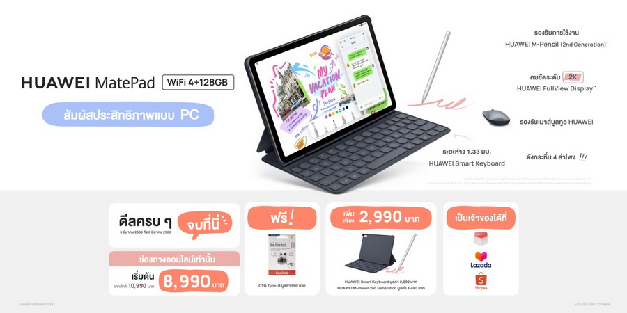 HUAWEI MatePad รุ่น WIFI 4+128GB วางจำหน่ายช่องทางออนไลน์เริ่มต้นเพียง 8,990 บาท จากราคาปกติ 10,990 บาท รับฟรี Flash Drive ความจุ 32GB มูลค่า 990 บาท และสั่งซื้อ HUAWEI Smart Keyboard และปากกาอัจฉริยะ HUAWEI M-Pencil Package 2nd generation ในราคาเพียง 2,990 บาท จากมูลค่ารวมปกติ 6,780 บาท ที่