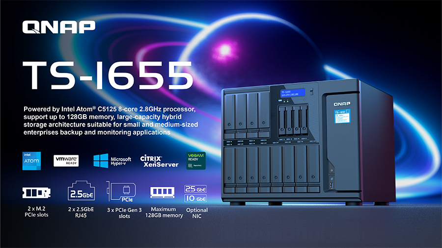 QNAP® Systems, Inc. ผู้คิดค้นโซลูชันการประมวลผล เครือข่าย และการจัดเก็บข้อมูลชั้นนำ เปิดตัวระบบจัดเก็บข้อมูล NAS ระดับ 2.5GbE ความจุสูงรุ่น TS-1655 ซึ่งรองรับฮาร์ดไดร์ฟขนาด 3.5 นิ้วได้ 12 ตัว และโซลิดสเตตไดร์ฟขนาด 2.5 นิ้ว 4 ตัว ระบบจัดเก็บข้อมูลรุ่น TS-1655 ออกแบบมาให้มีสถาปัตยกรรมจัดเก็บข้อมูลแบบไฮบริด ลงตัวทั้งในแง่สมรรถนะและต้นทุน มาพร้อมขุมพลังประมวลผลระดับ 8-core ความเร็วสูงระดับ 2.5GbE และขยาย PCIe ได้ เพื่อเพิ่มประสิทธิภาพทางธุรกิจ ทั้งการแชร์ไฟล์ข้ามทีม ทำงานร่วมกัน สำรอง/กู้คืนข้อมูล และจำลองคอมพิวเตอร์เสมือน