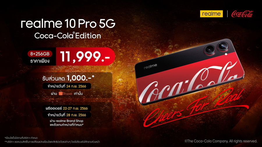 สำหรับใครที่อยากเป็นเจ้าของก็ ต้องรีบจับจอง! realme 10 Pro 5G Coca-Cola Edition ความจุ 8+256GB มาในราคา 11,999 บาท โดยสามารถเป็นเจ้าของได้ก่ อนใครผ่านช่องทางออนไลน์ ซึ่ง exclusive เฉพาะช่องทาง Shopee ในวันที่ 24 กุมภาพันธ์ นอกจากนี้สำหรับ 100 ออเดอร์แรกจะได้รับส่วนลดสูงสุด 1,000 บาท และสำหรับช่องทาง realme brand shop และตัวแทนจำหน่ายที่กำหนด เปิดให้พรีออเดอร์ได้ตั้งแต่วั นที่ 22 กุมภาพันธ์ – 27 กุมภาพันธ์ และจำหน่ายพร้อมกันในวันที่ 28 กุมภาพันธ์เป็นต้นไป