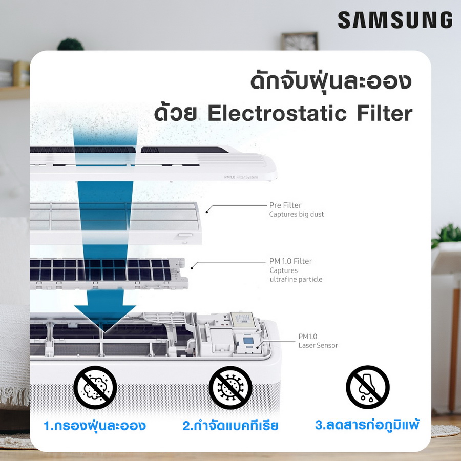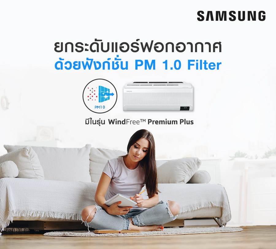 การดูแลสุขภาพภายในบ้านก็เป็นเรื่องที่จำเป็นอย่างยิ่ง หากค่าฝุ่นสูงกว่ามาตรฐานควรปิดประตูหน้าต่าง เพื่อป้องกันฝุ่นละอองขนาดเล็ก ในขณะเดียวกัน การเลือกเครื่องปรับอากาศที่สามารถกรอง PM 2.5 ได้ในเครื่องเดียว อย่างเครื่องปรับอากาศซัมซุงที่มาพร้อมเทคโนโลยี WindFree™ Cooling เย็นฉ่ำ... เย็นสบาย…ลมไม่ปะทะตัว เป็นนวัตกรรมความเย็นสบายที่ลมไม่ปะทะตัว ช่วยกระจายลมได้อย่างนุ่มนวลและเงียบผ่านรูขนาดเล็ก 23,000 รู ทำให้ไม่รู้สึกหนาวจากลมเย็นที่มากระทบผิวอีกต่อไป และยังมี PM 1.0 Filter System สามารถฟอกอากาศได้อย่างละเอียดถึงฝุ่นจิ๋ว PM 1.0 ที่อันตรายกว่า PM 2.5 เพราะมีอนุภาคขนาดเล็กสามารถซึมทะลุถุงลมปอดเข้าไปในเส้นเลือดที่ไปเลี้ยงหัวใจและสมอง ก่อเป็นปัจจัยที่เพิ่มความเสี่ยงต่อการเกิดโรคต่างๆ ให้ชัดเจนและรวดเร็วยิ่งขึ้น ด้วยแผ่นกรองอากาศ PM 1.0 ที่สามารถดักจับฝุ่นขนาดเล็กจิ๋วช่วยทำให้อากาศภายในห้องสะอาดได้อย่างรวดเร็ว พร้อมทั้งยังสามารถถอดล้างทำความสะอาดได้ตลอดอายุการใช้งาน ช่วยประหยัดเรื่องค่าใช้จ่ายในการซื้อแผ่นกรองอากาศ เหมาะสำหรับครอบครัวที่มีสมาชิกหลากหลายช่วงอายุและคนที่เป็นภูมิแพ้ ซึ่งเทคโนโลยีนี้จะมีในเครื่องปรับอากาศซัมซุงแบบติดผนังรุ่น WindFree™ Premium Plus หรือแบบติดฝ้าเพดาน (CAC) รุ่น WindFree™ 1Way Cassette, WindFree™ 4Way Cassette และ 360 Cassette