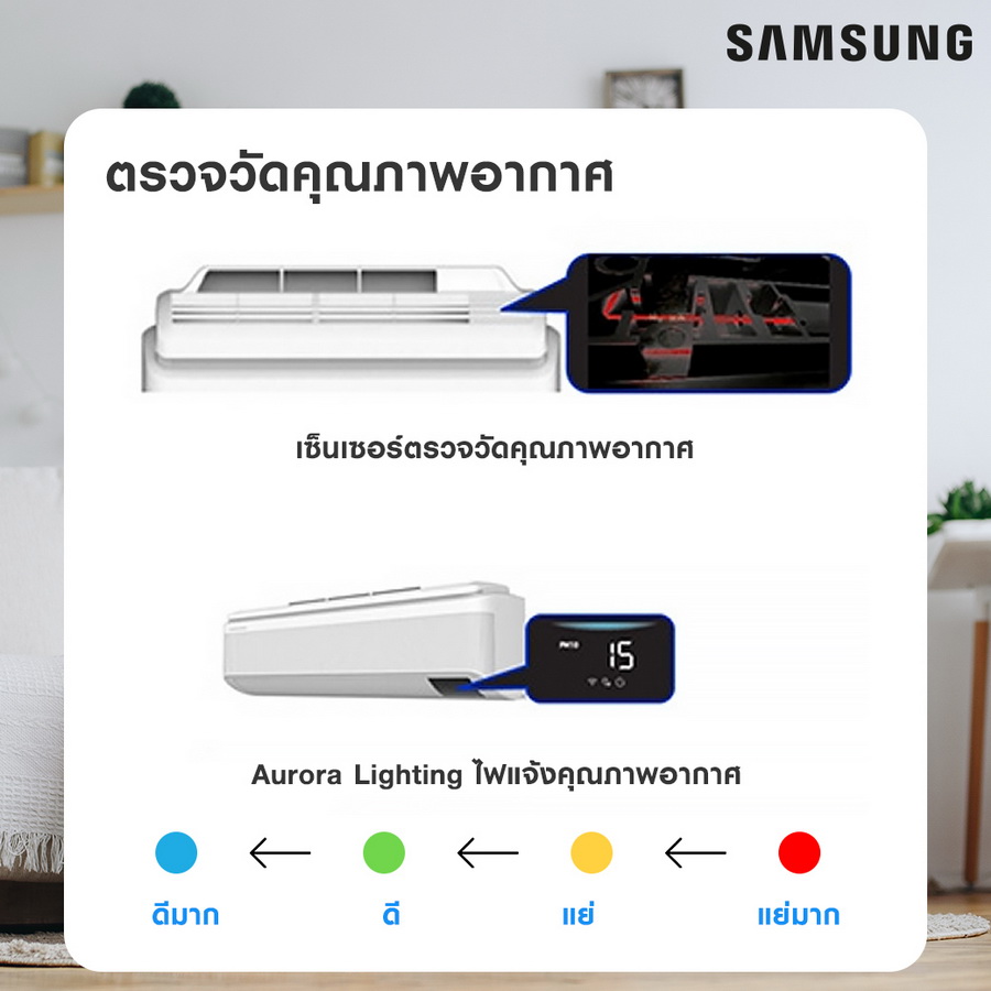 สถานการณ์มลพิษทางอากาศและฝุ่นกำลังเพิ่มขึ้นเกินค่ามาตรฐานไปจนถึงขั้นที่มีผลกระทบต่อสุขภาพ (สีแดง-แดงเข้ม) โดยศูนย์แก้ไขปัญหามลพิษทางอากาศ ยังคงรายงานปัญหาที่ต่อเนื่องเกี่ยวกับปริมาณ PM 2.5 ที่เพิ่มสูงขึ้นในประเทศไทย พบเกินค่ามาตรฐานเกือบทั่วทุกภาค บางจังหวังหวัดมีค่า AQI พุ่งทะลุ 300 ซึ่งส่งผลกระทบต่อทุกคนทั้งในบ้านโดยเฉพาะนอกบ้าน ซึ่งฝุ่น PM 2.5 สามารถเข้าสู่ร่างกายทางเดินหายใจ เข้าสู่หลอดลมและปอด และเข้าสู่กระแสเลือด ทำให้เสี่ยงต่อโรคหลอดเลือดในสมอง โรคปอดอุดกลั้นเรื้อรัง โรคหัวใจขาดเลือด มะเร็งปอด โรคติดเชื้อเฉียบพลันของระบบทางเดินหายใจส่วนล่าง ถือว่าเป็นภัยที่มองไม่เห็นและเป็นเรื่องใกล้ตัวทุกคนอย่างจริงจัง ซัมซุงผู้เชี่ยวชาญนวัตกรรมด้าน Aircare จึงขอแนะการใช้ชีวิตที่หลีกเลี่ยงหรือป้องกันมลพิษดังกล่าว ด้วยการเฝ้าระวังสุขภาพ หลีกเลี่ยงการออกจากบ้านโดยไม่จำเป็น งดการทำกิจกรรมกลางแจ้ง ลดการใช้รถยนต์อาจจะต้องมี Work Form Home เพื่อลดฝุ่นบนท้องถนน ตรวจสอบและซ่อมบำรุงอุปกรณ์เครื่องยนต์เพื่อให้เกิดการเผาไหม้ที่สมบูรณ์ หรือใช้อุปกรณ์ป้องกันตนเองเช่น สวมหน้ากากอนามัยที่สามารถป้องกัน PM 2.5 อาทิ หน้ากากอนามัย N95 หากมีอาการทางสุขภาพควรปรึกษาแพทย์