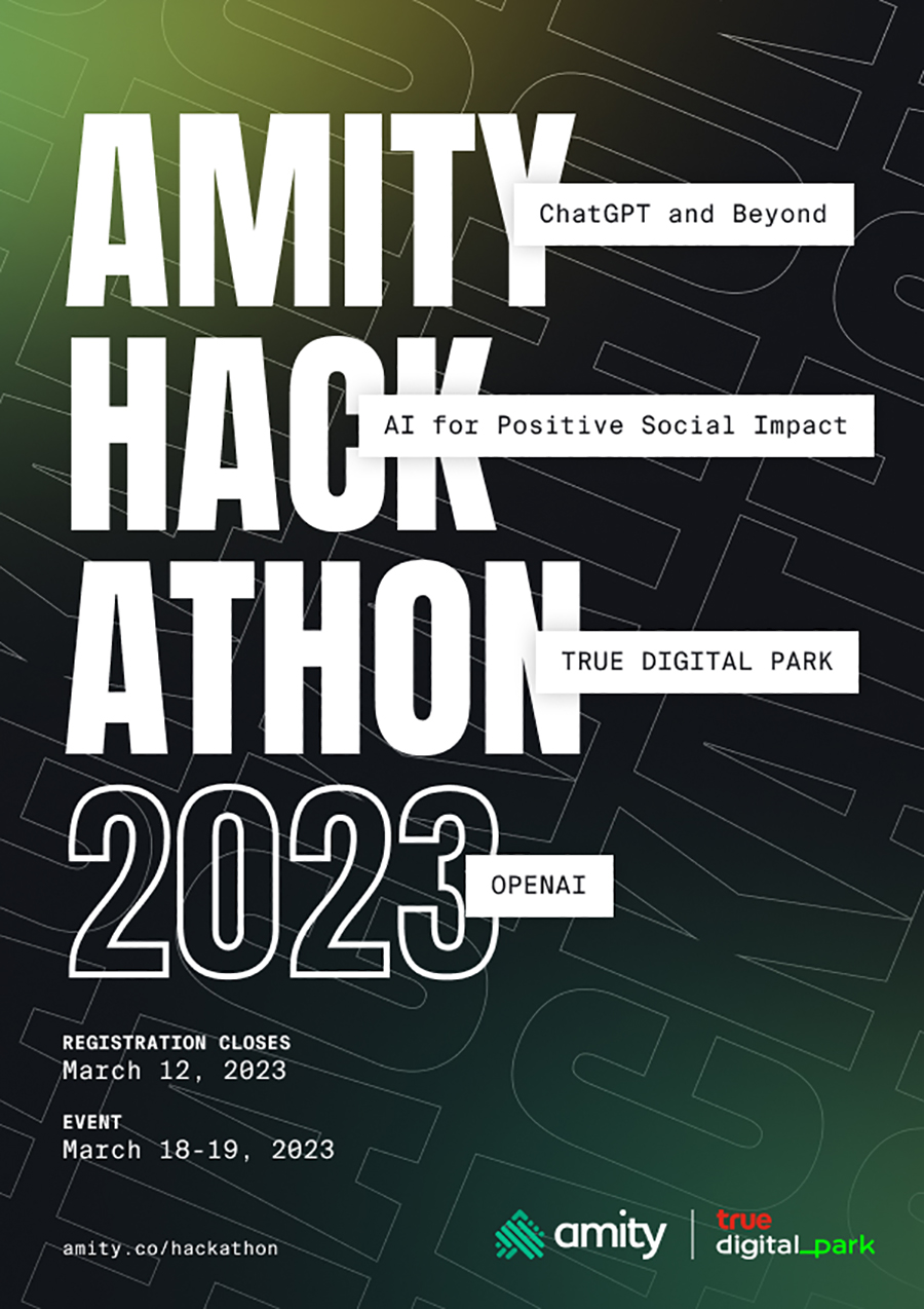 นับเป็นครั้งแรกสำหรับโครงการ "Amity Hackathon 2023: ChatGPT and Beyond" ที่ Amity จัดขึ้น ภายใต้โจทย์แนวคิด "AI for Positive Social Impact" การจัดกิจกรรมในครั้งนี้มีวัตถุประสงค์หลักคือเพื่อผลักดันและจุดประกายให้ผู้มีความสามารถเกิดการพัฒนารังสรรค์นวัตกรรมโซลูชันโดยนำเทคโนโลยี Generative AI ขั้นสูงซึ่งสามารถสร้างข้อความและการตอบสนองได้เหมือนมนุษย์ในแบบเรียลไทม์ มาสร้างให้เกิดผลกระทบในเชิงบวกต่อสังคม การแข่งขันแฮกกาธอนนี้ถือได้ว่าเป็นเวทีสำหรับนักพัฒนาเพื่อค้นหาศักยภาพของเทคโนโลยี AI ขั้นสูง และสามารถนำเอาเทคโนโลยีดังกล่าวมารับมือกับความท้าทายทางสังคมในโลกแห่งความเป็นจริง