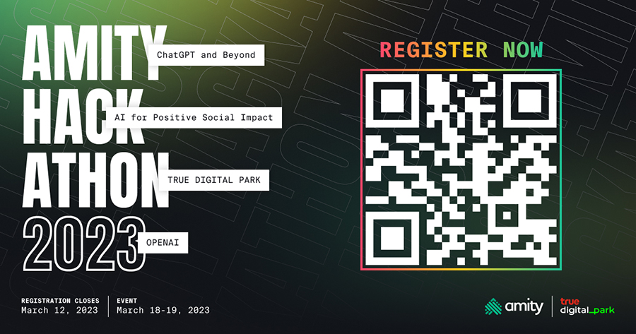 Amity Hackathon 2023: ChatGPT and Beyond เปิดรับสมัครตั้งแต่วันนี้จนถึง 12 มีนาคม 2566 โปรดติดตามรายละเอียด และกฎกติกาเพิ่มเติมผ่านทางออนไลน์ที่เว็บไซต์ www.amity.co/hackathon รวมถึงการประกาศผลผู้ผ่านการคัดเลือกเข้ารอบสุดท้ายในวันที่ 15 มีนาคม 2566