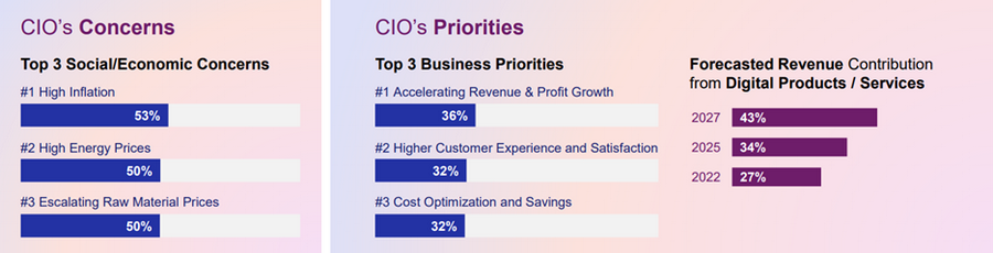 CIO Technology Playbook เป็นการศึกษาจากเหล่า CIO และผู้ที่มีอำนาจในการตัดสิ นใจด้านไอทีกว่า 900 รายในภูมิภาคเอเชียแปซิฟิก (AP) ผลลัพธ์แสดงให้เห็นถึงความกั งวลของ CIO ต่อเศรษฐกิจมหภาคที่ส่งผลต่ อการเติบโตทางธุรกิจในปี 2566 และในช่วงต้นปี 2567 โดย 53% ของผู้ตอบแบบสอบถาม ระบุว่า ‘อัตราเงินเฟ้อสูง’ เป็นเรื่องน่ากังวลที่สุดในปี 2566 และครึ่งหนึ่งของ CIO ที่ตอบแบบสอบถาม (50%) จัดอันดับให้ “ราคาของพลังงานที่ปรับตัวสูงขึ้ น” และ “ราคาวัตถุดิบที่สูงขึ้น” เป็นความท้าทายที่สำคัญ