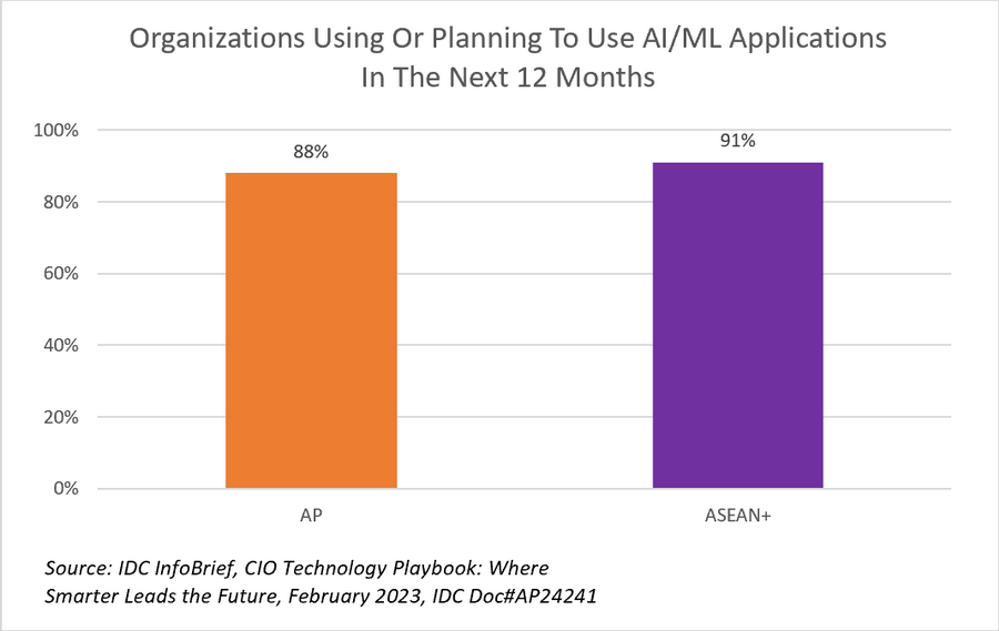 เทคโนโลยี AI จะเป็นกระแสหลักในปี 2566: การประยุกต์ใช้เทคโนโลยี AI เพื่อยกระดับประสบการณ์ลูกค้ ากำลังเป็นที่นิยมมากขึ้นในหมู่ CIO ในภูมิภาคเอเชียแปซิฟิก กว่า 88% ขององค์กรในภูมิภาคเอเชียแปซิฟิ กกำลังใช้หรือวางแผนที่ จะนำแอปพลิเคชั่น AI/ML มาใช้ในอีก 12 เดือนข้างหน้า นอกจากนี้ยังพบว่า 91% ขององค์กรมีการใช้งานหรื อวางแผนที่จะใช้แอปพลิเคชั่นด้ าน AI ในปีหน้า และจะมีความโดดเด่นมากยิ่งขึ้ นในภูมิภาคอาเซียน+