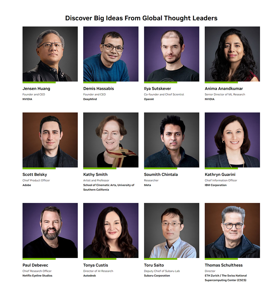พร้อมกันนี้คาดว่าจะมีผู้เข้าร่วมมากกว่า 250,000 คน ในการลงทะเบียนเข้าร่วมงานตลอด 4 วัน ซึ่งจะรวมถึง 650+ หัวข้อจากนักวิจัย นักพัฒนา และผู้นำอุตสาหกรรมในแทบทุกสาขาของคอมพิวเตอร์ นอกจากนี้ GTC ยังนำเสนอการสนทนาที่เป็นกันเองกับ Huang และ Ilya Sutskever ผู้ร่วมก่อตั้ง OpenAI รวมถึงการพูดคุยโดย Demis Hassabis จาก DeepMind, Emad Mostaque จาก Stability AI และอื่น ๆ อีกมากมาย