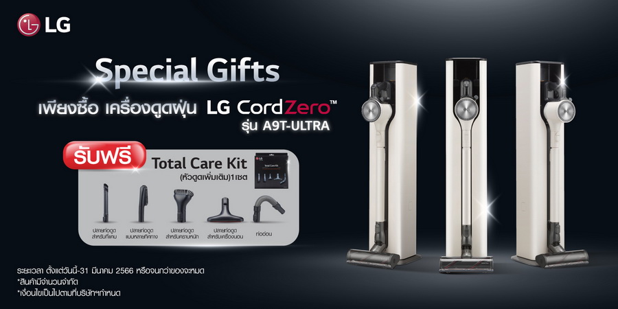 บริษัท แอลจี อีเลคทรอนิคส์ (ประเทศไทย) จำกัด ผู้นำระดับโลกด้านการพัฒนานวัตกรรมเครื่องใช้ไฟฟ้าภายในบ้าน ส่งนวัตกรรมเครื่องดูดฝุ่นไร้สาย LG CordZero™ รุ่น A9T-ULTRA โดดเด่นด้วยดีไซน์แบบ All-in-One Tower™ ที่ช่วยให้สะดวกต่อการจัดเก็บอุปกรณ์ทำความสะอาดภายในแท่นชาร์จ พร้อมระบบขจัดฝุ่นอัตโนมัติที่แก้ปัญหาฝุ่นละอองฟุ้งกระจายขณะทำความสะอาดถังเก็บฝุ่น ขับเคลื่อนด้วยเทคโนโลยี Dual PowerPack™ แบตเตอรี่สองก้อนที่สับเปลี่ยนกันใช้งานได้ ทำให้สามารถทำความสะอาดและชาร์จไฟได้พร้อมกัน และใช้งานอย่างต่อเนื่องได้ยาวนานสูงสุดถึง 120 นาที พร้อมเทคโนโลยี Kompressor™ ช่วยบีบอัดฝุ่นและเศษผมในถังเก็บฝุ่นได้มากขึ้นถึง 2.4 เท่าของปริมาณที่ไม่ผ่านการบีบอัด และประหยัดเวลาในการทำความสะอาด นอกจากนี้ เพื่อช่วยให้ผู้บริโภคชาวไทยใช้เวลาที่บ้านได้อย่างปลอดภัยในช่วงที่ปัญหาฝุ่นละอองในอากาศยังคงส่งผลกระทบต่อการใช้ชีวิตของผู้คนอย่างต่อเนื่อง เมื่อซื้อเครื่องดูดฝุ่นไร้สาย LG CordZero™ รุ่น A9T-ULTRA แถมฟรี! ชุดอุปกรณ์เสริมหัวดูดสำหรับการทำความสะอาด 5 หัว (Total Care Kit) ตั้งแต่วันนี้หรือจนกว่าสินค้าจะหมด ณ ห้างสรรพสินค้าชั้นนำหรือตัวแทนจำหน่ายของแอลจีทั่วประเทศ