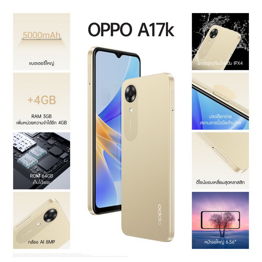 OPPO A17k สมาร์ตโฟนระดับเริ่มต้นในราคาสุดคุ้ม มอบประสบการณ์ใช้งานสุดด้วยแบตเตอรี่ขนาดใหญ่ 5,000mAh ใช้งานได้ยาวนานตลอดวันไม่มีสะดุด หน่วยความจำจุใจ RAM 3GB เพิ่มหน่วยความจำได้อีก 4GB พร้อม ROM 64GB ให้คุณใช้งานสะดวก ปลดล็อกโทรศัพท์ได้ง่ายด้วยสแกนลายนิ้วมือด้านข้าง พร้อมทนทานด้วยมาตรฐานกันน้ำระดับ IPX4 เต็มอิ่มทุกความบันเทิงด้วยหน้าจอขนาดใหญ่ 6.56 นิ้ว HD+ ให้สีสันเต็มอิ่ม และระบบเสียง Dirac 3.0 พร้อมโหมด Ultra Volume มอบเสียงลำโพงดังถูกใจ ขับเคลื่อนด้วยชิปประมวลผล MediaTek Helio G35 ถ่ายภาพบุคคลได้งดงามด้วยกล้อง AI 8MP สวยโดดเด่นด้วยดีไซน์ Ultra-Slim ขอบเหลี่ยมสุดคลาสสิก น้ำหนักเบา พกพาสะดวก
