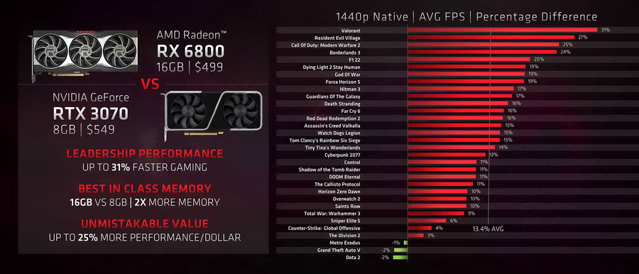 - Radeon RX 6800 vs. RTX 3070 – ด้วยประสิทธิภาพด้านการเล่นเกมที่เร็วขึ้นสูงสุด 31 เปอร์เซ็นต์ เพิ่มความจุหน่วยความจำเป็นสองเท่า และประสิทธิภาพด้าน FPS/$ ที่ดีขึ้นสูงสุด 25 เปอร์เซ็นต์ ทำให้กราฟิกการ์ด AMD Radeon RX 6800 เป็นกราฟิกการ์ดที่คุณไม่ต้องลังเลอีกต่อไปเพื่อการเล่นเกมที่ความละเอียด 1440p
