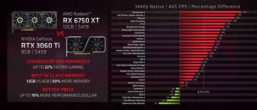 - Radeon RX 6750 XT vs. RTX 3060 Ti – ด้วยประสิทธิภาพการประมวลผลที่เร็วขึ้นสูงสุด 22 เปอร์เซ็นต์ ความจุหน่วยความจำที่เพิ่มขึ้น 50 เปอร์เซ็นต์ และประสิทธิภาพด้าน FPS/$ ที่ดีขึ้นสูงสุด 19 เปอร์เซ็นต์ ทำให้กราฟิกการ์ด AMD Radeon RX 6750 XT เป็นตัวเลือกที่เหนือกว่าอย่างเห็นได้ชัด