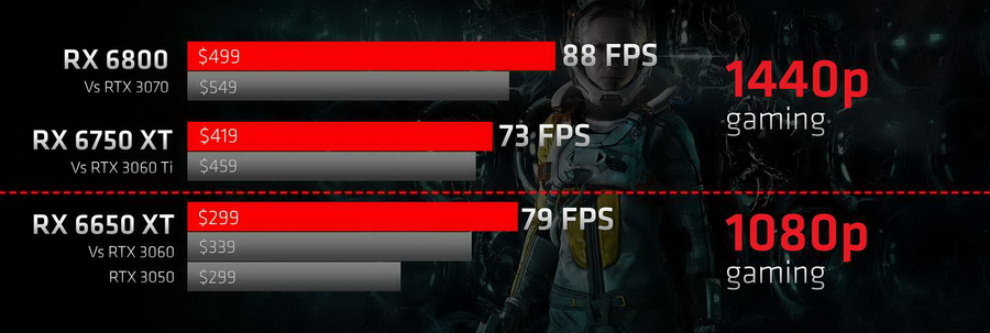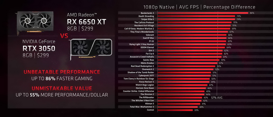 - Radeon RX 6650 XT vs. RTX 3050 – ด้วยประสิทธิภาพด้านการประมวลผลที่สูงขึ้นถึง 86 เปอร์เซ็นต์และประสิทธิภาพด้าน FPS/$ ที่ดีขึ้นสูงสุด 55 เปอร์เซ็นต์ ทำให้เกมเมอร์ที่ใช้กราฟิกการ์ด AMD Radeon เป็นผู้ชนะอย่างแท้จริงในด้านประสิทธิภาพการเล่นเกมในความละเอียด 1080p ที่ยอดเยี่ยมที่สุดในผลิตภัณฑ์ระดับราคาเดียวกัน