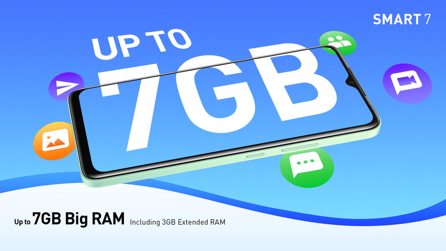 Infinix SMART 7 มาพร้อมกับดีไซน์มินิมอล สวยงาม ทันสมัย และมีเอกลักษณ์เฉพาะตัว ใช้วัสดุแข็งแรงทนทาน จับถนัดมือ ขับเคลื่อนทุกความบันเทิงด้วยระบบปฏิบัติการ Android™ 12 โดยรุ่นใหม่นี้ได้รับการพัฒนาและต่อยอดมาจากรุ่น SMART 6 อีกทั้งยังคงเน้นจับกลุ่มผู้ใช้งานทั่วไปที่มีไลฟ์สไตล์หลากหลาย ซึ่งชูจุดขายด้วยการอัปเกรดศักยภาพการใช้งานแบบไร้ขีดจำกัดด้วยพื้นที่ความจุถึง 64GB และสามารถขยายพื้นที่แรมจากเดิม 4GB เพิ่มได้อีก 3GB จึงเสมือนได้แรมมากสุดถึง 7GB ช่วยให้เปิดใช้งานแอปพลิเคชันได้หลากหลายในขณะเดียวกัน และมาพร้อมหน้าจอใหญ่ถึง 6.6 นิ้ว ความละเอียด HD+ ซึ่งทำให้ภาพมีสีสันสดใส สว่างคมชัดแม้จะอยู่ในที่ที่มีแสงแดดจ้า จึงช่วยเพิ่มอรรถรสในการรับชมความบันเทิงได้มากยิ่งขึ้น