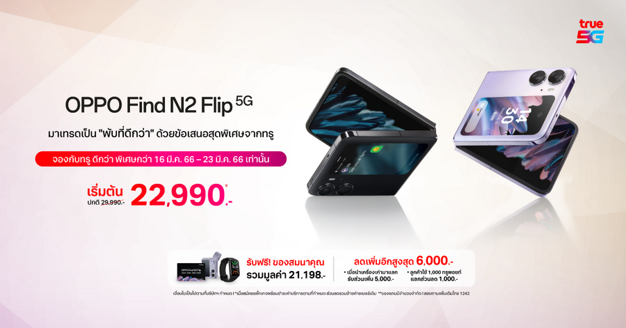 True 5G มอบประสบการณ์อัจฉริยะ และข้อเสนอสุดพิเศษที่คัดสรรสำหรับลูกค้าทรูโดยเฉพาะ เป็นเจ้าของ OPPO Find N2 Flip ได้ในราคาเบา ๆ เริ่มเพียง 22,990 บาท เมื่อสมัครแพ็กเกจรายเดือนที่กำหนด รับฟรี! ของสมนาคุณสุดพิเศษ OPPO e-VIP Card ประกันจอแตก นาน 1 ปี, OPPO Band 2 และ OPPO Find N2 Flip Portable PU Case รวมมูลค่ากว่า 21,198 บาท พิเศษ! ลดเพิ่มสูงสุด 6,000 บาท เมื่อนำเครื่องเก่ามาแลกรับส่วนลด 5,000 บาท ลูกค้าทรูใช้ 1,000 ทรูพอยท์แลกรับส่วนลด 1,000 บาท พร้อมโปรผ่อนสบาย ๆ 0% นาน 10 เดือนหรือผ่อนสบายกระเป๋านานสูงสุด 36 เดือนผ่าน PayNext extra