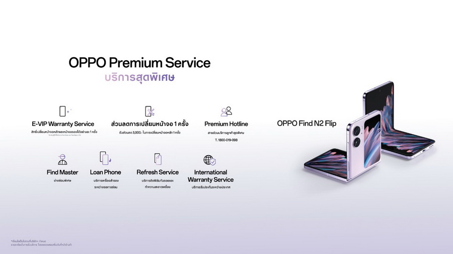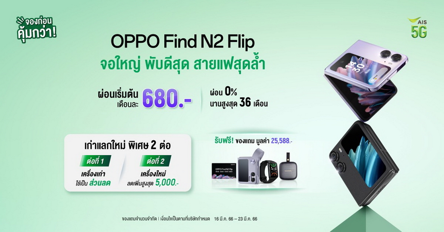 OPPO เปิดจองสมาร์ตโฟนรุ่นใหม่ OPPO Find N2 Flip สมาร์ตโฟนจอพับรุ่นแรกของออปโป้ ภายใต้สโลแกน “พับที่ดีกว่า” จองกับ AIS มอบส่วนลดสูงสุด 6,500 บาท รับสิทธิ์ผ่อน 0% นานสูงสุด 36 เดือน นำเครื่องเก่าแลกใหม่รับสิทธิ์ 2 ต่อ เป็นส่วนลดเพิ่มอีก 5,000 บาท รับสิทธิ์อัปเกรด Serenade เหนือกว่าใครทันที และของแถมพิเศษรวมมูลค่าสูงสุด 25,588 บาท พิเศษส่วนลดเพิ่ม 1,000 บาท เฉพาะลูกค้าย้ายเบอร์เดิมมาเป็นครอบครัวเอไอเอสรายเดือน เมื่อสั่งซื้อเครื่องพร้อมกับแพ็กเกจรายเดือน 5G Hot Deal Max Speed ตามเงื่อนไขบริษัทฯ กำหนด