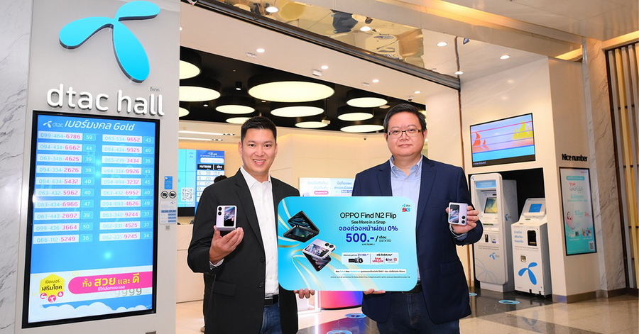 OPPO ผนึกกำลัง dtac มอบโปรโมชันสุดพิเศษไปกับ OPPO Find N2 Flip สมาร์ตโฟนจอพับรุ่นแรก ที่พร้อมมอบประสบการณ์พับที่ดีกว่า ด้วยส่วนลดสูงสุด 12,000 บาท เปิดจอง OPPO Find N2 Flip ในราคาเริ่มต้นเพียง 17,990 บาท ไม่ต้องชำระค่าบริการล่วงหน้า เมื่อสมัครแพ็กเกจตามที่กำหนด พร้อมดูทรู อันล็อก นาน 12 เดือน และรับชม EPL ครบทุกแมตช์ ตลอดฤดูกาล 2022/23 และรับสิทธิ์ dtac mobile care นาน 1 เดือน เท่านั้นยังไม่พอ! รับของสมนาคุณจาก OPPO ฟรี! E-VIP Card (มูลค่า 17,000 บาท) OPPO Band 2 (มูลค่า 2,999 บาท) และ OPPO Find N2 Flip portable PU Case (มูลค่า 1,199 บาท) สั่งจองล่วงหน้าได้ที่ดีแทคออนไลน์สโตร์ หรือ ศูนย์บริการดีแทคที่ร่วมรายการ ตั้งแต่วันนี้ – 23 มีนาคม 2566 จองเลย https://www.dtac.co.th/s/Cf2nmQN