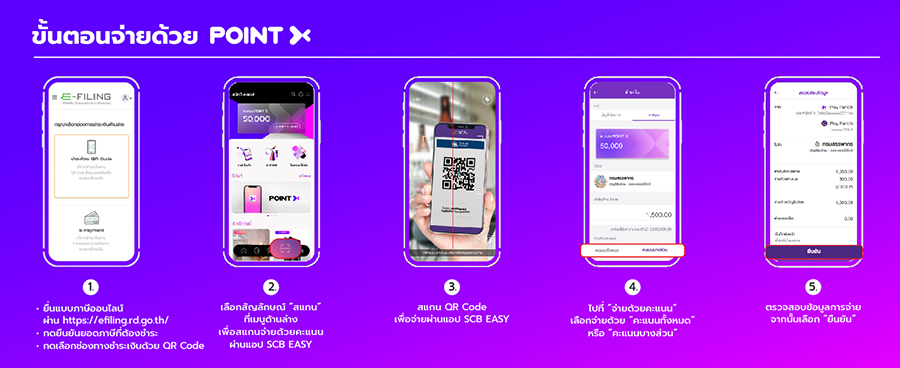 ล่าสุดลูกค้าสามารถใช้ PointX ชำระค่าภาษีเงินได้บุคคลธรรมดาแทนเงินสด ผ่านฟีเจอร์สแกนจ่ายผ่าน QR Code (Scan & Pay) เมื่อยื่นแบบและชำระภาษีทางอิเล็กทรอนิกส์ (E-FILING) ในระบบกรมสรรพากรได้แล้ววันนี้ โดยเลือกช่องทางชำระเงินด้วย QR Code ลูกค้าสามารถเลือกจ่ายด้วยพอยท์ทั้งหมด หรือจ่ายด้วยพอยท์บางส่วนได้ สอบถามข้อมูลเพิ่มเติมได้ที่ SCB Call Center 02-777-7777 หรือเว็บไซต์ www.pointx.scb/taxpayment
