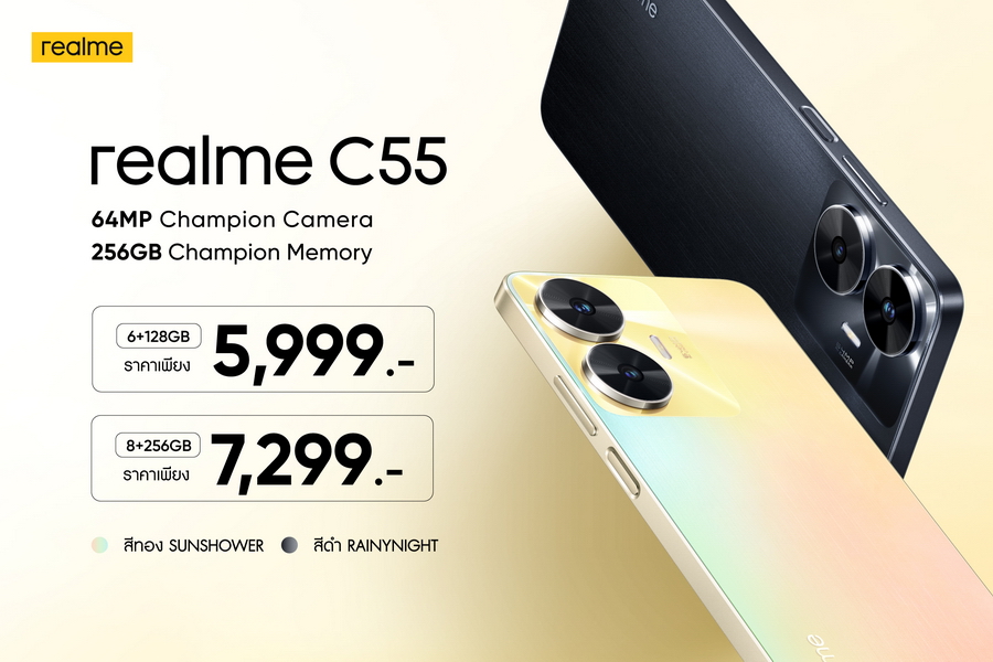realme C55 วางจำหน่ายด้วยกัน 2 สีคือ สี Sunshower และสี Rainy Night รุ่นความจุ 6+128GB ราคา 5,999 บาทและรุ่นความจุ 8+256GB ราคา 7,299 บาท โดยวางจำหน่ายพร้อมกันในวันที่ 31 มีนาคมผ่านช่องทาง realme brand shop และตัวแทนจำหน่ายทั่วประเทศ พิเศษ! สำหรับช่องทางออนไลน์ สามารถเป็นเจ้าของ realme C55 ได้ก่อนใคร โดย เอ็กซ์คลูซีฟเฉพาะช่องทาง Lazada ที่เดียว พร้อมราคาสุดพิเศษเฉพาะวันที่ 27 มีนาคม –1 เมษายน โดย realme C55 รุ่นความจุ 6+128GB จะได้รับส่วนลดสูงสุด 500 บาท (ราคาพิเศษเพียง 5,499 บาท) และผู้ที่สั่งซื้อ realme C55 รุ่นความจุ 8+256GB เป็น 200 ออเดอร์แรก รับไปเลยทันทีกระเป๋า Backpack