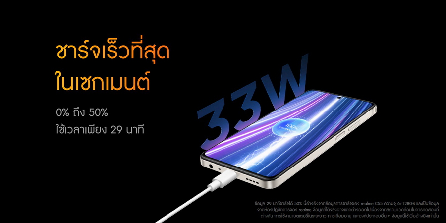 เรียลมีเข้าใจถึงไลฟ์สไตล์ของชี วิตยุคใหม่ จึงใส่เทคโนโลยีระบบชาร์จเร็ว 33W SUPERVOOC สามารถชาร์จแบตเตอรี่ขนาด 5000mAh จาก 0-100% ในเวลาเพียง 63 นาที ผู้ใช้งานจึงไม่ต้องกังวลเรื่ องประสิทธิภาพการใช้งานระหว่ างวัน