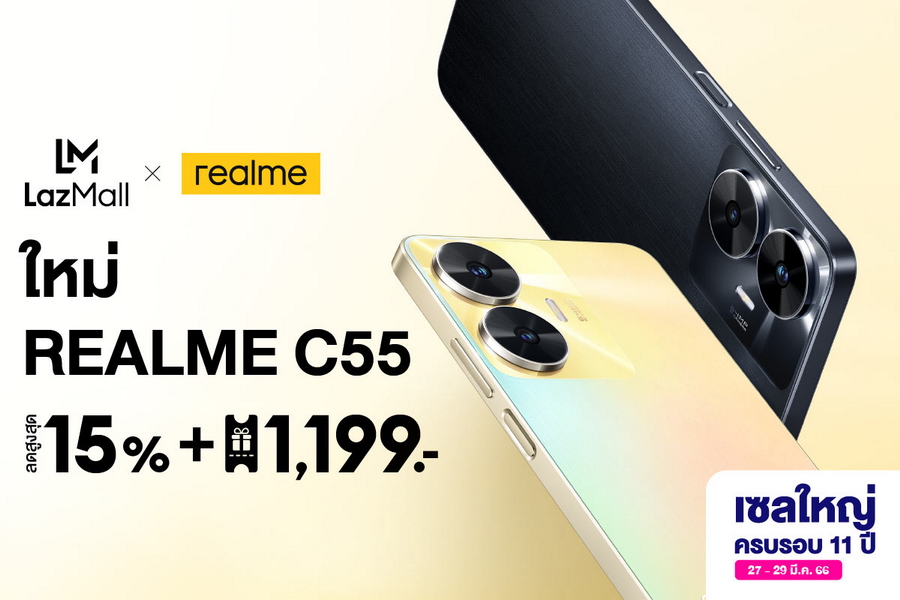 - พิเศษ! เรียลมี เปิดตัวสมาร์ตโฟนรุ่นใหม่ล่าสุด realme C55 ในราคาสุดปัง จำนวน 2 รุ่น เอ็กซ์คลูซีฟทางออนไลน์บนแอปฯ ลาซาด้าเท่านั้น โดย realme C55 รุ่นความจุ 6+128GB จะมาในราคาพิเศษเพียง 5,499 บาท และสำหรับนักช้อปที่สั่งซื้อ realme C55 รุ่นความจุ 8+256GB เป็น 200 ออเดอร์แรก รับไปเลยทันทีกระเป๋า Backpack สุดพิเศษ มูลค่า 1,199 บาท เฉพาะวันที่ 27 มีนาคม – 1 เมษายน เท่านั้น