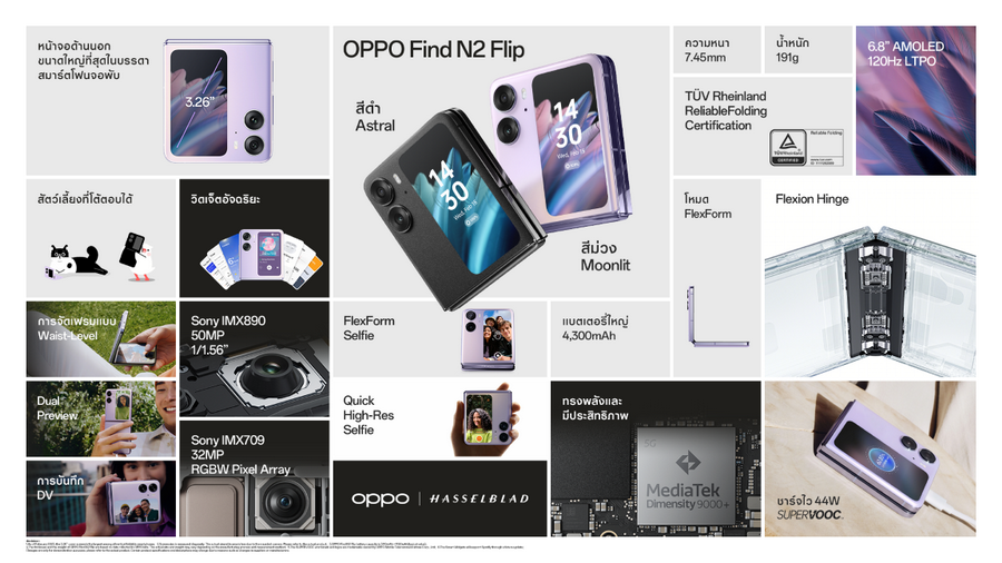 OPPO Find N2 Flip สมาร์ตโฟนจอพับเพื่อ “พับที่ดีกว่า” มาพร้อมการผสานดีไซน์และฟังก์ชั่นที่สมบูรณ์แบบที่สุด ด้วยหน้าจอด้านนอกที่มีขนาดใหญ่ที่สุดในอุตสาหกรรมถึง 3.26 นิ้ว ใหญ่กว่า ทำอะไรได้มากกว่า ไม่ว่าจะเช็คการแจ้งเตือนหรือตอบกลับข้อความ ก็ทำได้โดยไม่ต้องเปิดหน้าจอหลัก พับปิดสนิทไร้ช่องว่างด้วยนวัตกรรม Flexion Hinge มอบความทนทานในการพับ โดยสามารถพับได้ถึง 400,000 ครั้ง เทียบเท่าการใช้งานถึง 100 ครั้งต่อวัน เป็นเวลาถึง 10 ปี และยังพกพาได้สะดวกตัวเครื่องที่มีน้ำหนักเพียง 191 กรัม และมีความบางเพียง 7.45 มม. เมื่อพับครึ่ง