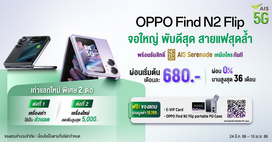 ซื้อกับ AIS รับส่วนลดสูงสุด 5,500 บาท รับ OPPO Find N2 Flip ในราคาเริ่มต้นเพียง 24,490 บาท ผ่อน 0% นานสูงสุด 36 เดือน นำเครื่องเก่าแลกใหม่รับสิทธิ์ 2 ต่อ เป็นส่วนลดเพิ่มอีก 5,000 บาท รับสิทธิ์อัปเกรด Serenade เหนือกว่าใครทันที และของแถมพิเศษรวมมูลค่าสูงสุด 18,199 บาท เมื่อสั่งซื้อเครื่องพร้อมกับแพ็กเกจรายเดือน 5G Hot Deal Max Speed ตามเงื่อนไขบริษัท ที่เอไอเอสช็อป, เทเลวิซ, AIS Online store https://m.ais.co.th/YyHBOQKfE