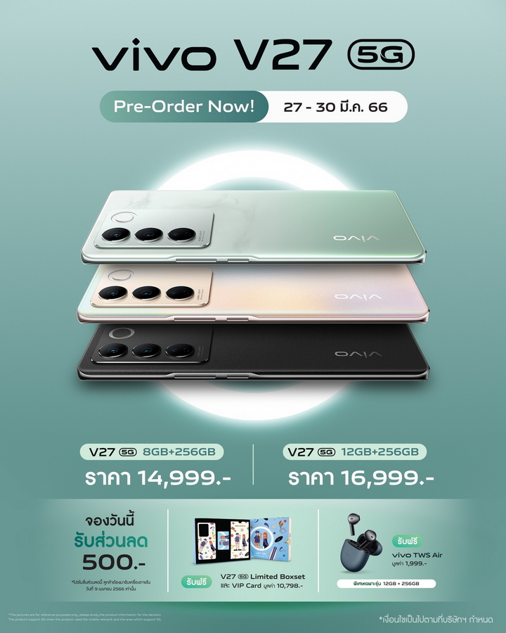vivo V27 5G เปิดให้จองแล้ววันนี้ ราคาเริ่มต้นเพียง 14,999 บาท จองวันนี้รับสิทธิ์พิเศษถึง 3 ต่อ