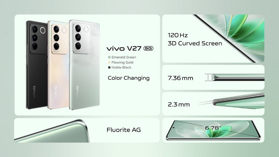 vivo V27 5G เปิดตัวพร้อมสีสันใหม่อย่างสีเขียวหยก หรือ “Emerald Green” ที่ได้รับแรงบันดาลใจจากหยก อัญมณีที่สื่อถึงความงดงามบริสุทธิ์และความสง่างามดั่งของขวัญที่ธรรมชาติรังสรรค์ขึ้น ฝาหลังผลิตด้วยนวัตกรรมกระจกเคลือบสีเขียวหยกเป็นครั้งแรกของวงการสมาร์ตโฟน ผสานเทคโนโลยี Color-Changing เฉพาะของ vivo เมื่อสัมผัสแสงยูวีฝาหลังจะไล่ระดับเฉดสี เป็นโทนสีเขียวหยกที่สว่างและเข้ม สร้างความรู้สึกและประสบการณ์การใช้งานที่แปลกใหม่ โดยก่อนเปลี่ยนสี จะให้ความรู้สึกที่สดใส บริสุทธิ์ เต็มไปด้วยชีวิตชีวา แต่เมื่อเปลี่ยนสีเป็นโทนสีเขียวเข้ม จะให้ความรู้สึกที่สุขุมนุ่มลึก สงบ เหมือนโอบล้อมอยู่ท่ามกลางภูเขาเขียวขจีและทะเลสาบ พร้อมขอบโทนสีเทาจาง ๆ บริเวณมุมโดยรอบเครื่อง ทำให้รูปลักษณ์ของ vivo V27 5G ดูเรียบหรู โดดเด่น และสง่างามสะกดทุกสายตา