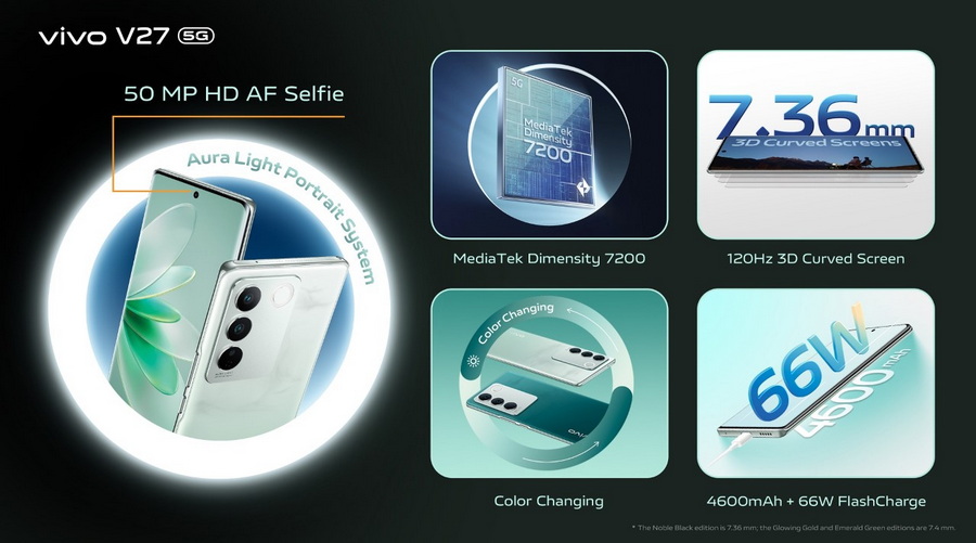 vivo แบรนด์สมาร์ตโฟนชั้นนำระดับโลก ประกาศเปิดตัว vivo V27 5G สมาร์ตโฟนรุ่นใหม่ล่าสุดจากตระกูล V Series อย่างเป็นทางการในประเทศไทย ภายใต้แนวคิด “ออร่าพอร์ตเทรต เผยทุกเฉดที่เป็นคุณ” (Aura Portrait Delight Every Moment) อัดแน่นด้วยฟีเจอร์ เทคโนโลยีและสมรรถนะรอบด้านที่ยกระดับการใช้งานสมาร์ตโฟนให้ล้ำไปอีกขั้น มาพร้อมไฮไลท์เด่นอย่างเทคโนโลยี “Aura Light Portrait System” ชูประสบการณ์ ถ่ายภาพพอร์ตเทรตขั้นเทพ เซลฟี่่คมชัดด้วยกล้องหน้า 50MP เนรมิตภาพถ่ายแบบมือโปรด้วยกล้องหลัก 50MP พร้อมโหมดถ่ายภาพให้เลือกอย่างจุใจ หน้าจอโค้ง 3D ขนาด 6.78 นิ้ว ดีไซน์บางเฉียบ พร้อมรีเฟรชเรทสูงถึง 120Hz จัดเต็มกับประสิทธิภาพการทำงานด้วยเทคโนโลยี Extended RAM ที่สามารถขยาย RAM ได้สูงสุดถึง 8GB ให้ทุกการใช้งานลื่นไหลไม่มีสะดุด ขับเคลื่อนด้วยขุมพลังชิปเซตใหม่จาก MediaTek ดีไซน์ตัวเครื่องพรีเมียมสุดล้ำ ฝาหลังแบบกระจกเทคโนโลยี Color-Changing Glass โดดเด่นมีสไตล์ด้วยลูกเล่นไล่เฉดสีตามอุณหภูมิ พร้อมเผยเฉดสีใหม่ “สีเขียวหยก” (Emerald Green) ที่ดูหรูหราพร้อมสะกดทุกสายตา
