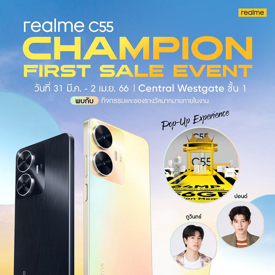 realme (เรียลมี) ชวนคุณมาสัมผัสตัวจริงเสียงจริงของแชมป์เปี้ยนสมาร์ตโฟนกับ realme C55 ประกาศการวางจำหน่ายใน Brand shop ทุกสาขา และศูนย์ตัวแทนจำหน่ายทั่วประเทศ ตั้งแต่วันที่ 31 มีนาคม เป็นต้นไป พร้อมเตรียมจัดกิจกรรมชูความเป็นแชมป์เปี้ยน "realme C55 Champion First Sale Event" ต้อนรับการเปิดจำหน่ายในวันที่ 31 มีนาคม - 2 เมษายน 2566 ณ บริเวณ ลานโปร F ชั้น 1 หน้าห้าง Central ศูนย์การค้าเซ็นทรัลเวสต์เกต ผู้เข้าร่วมงานจะได้เต็มอิ่มกับกิจกรรมและเกมต่าง ๆ มากมาย