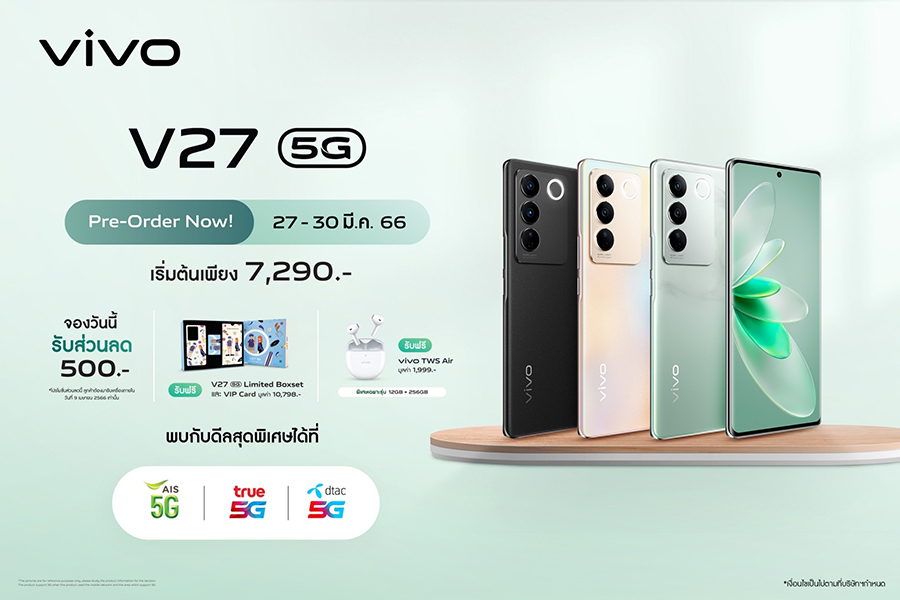 เริ่มจองเป็นเจ้าของ vivo V27 5G ได้แล้วตั้งแต่วันนี้ – 30 มีนาคม 2566 ที่ vivo Brand Shop ทุกสาขาและ BaNANA, IT City | CSC, Jaymart, TG FONE, KINGKONG, BKK, Big C, Maxlink, Powerbuy, Lotus, STAMP, Advice, แม่วังสื่อสาร, Power Mall และ Power Mart ทุกสาขาทั่วประเทศ