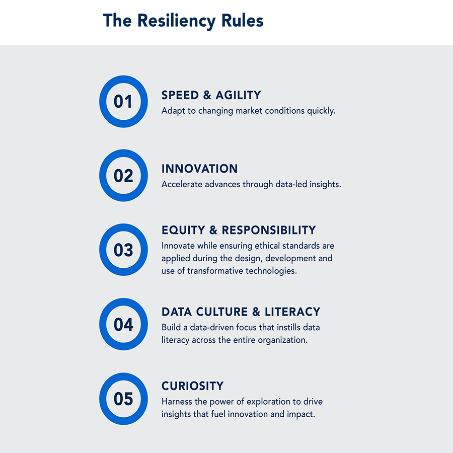 ประเด็นสำคัญจากการสำรวจผู้บริหารคือบทบาทสำคัญด้านข้อมูลและการวิเคราะห์ในการนำกฎความยืดหยุ่นไปใช้ ผู้บริหารที่มีความยืดหยุ่นสูงเกือบทั้งหมด (96%) ใช้ข้อมูลทั้งภายในและภายนอก และการวิเคราะห์ เพื่อช่วยตัดสินใจ ซึ่งเป็นกุญแจสำคัญในการนำทางการเปลี่ยนแปลง และช่วยให้เกิดความต่อเนื่องทางธุรกิจ ผู้บริหารธุรกิจที่มีความยืดหยุ่นสูงอ้างว่าใช้เครื่องมือข้อมูลมากกว่าเครื่องมืออื่นๆ ที่มีความยืดหยุ่นน้อย (93% เทียบกับ 22% ที่มีความยืดหยุ่นต่ำ)