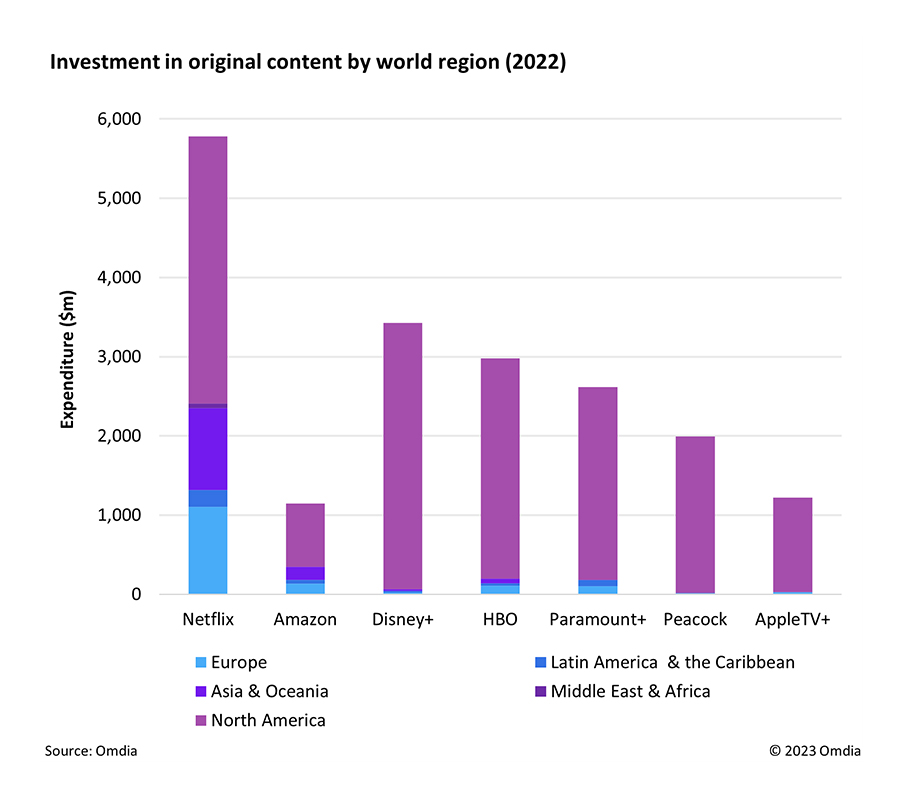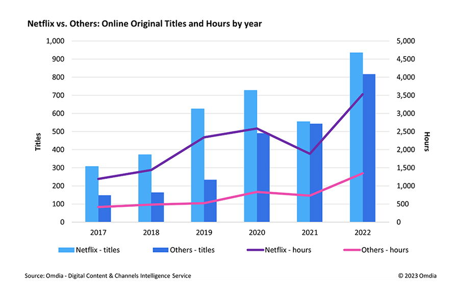 ออมเดีย ประมาณการว่าออริจินัลคอนเทนต์ของเน็ตฟลิกซ์จำนวน 935 เรื่องที่ออกฉายในปี 2565 (ไม่จำเป็นต้องเป็นปีเดียวกับที่ผลิต) มีมูลค่า 5.8 พันล้านดอลลาร์ในปีที่แล้ว นอกจากนี้ ออมเดียยังคาดการณ์ว่า 42% ของยอดทั้งหมดนี้เป็นการลงทุนโดยสตรีมเมอร์นอกอเมริกาเหนือ โดยลงทุน 1.1 พันล้านดอลลาร์ในยุโรป และ 1 พันล้านดอลลาร์ในเอเชียและโอเชียเนีย